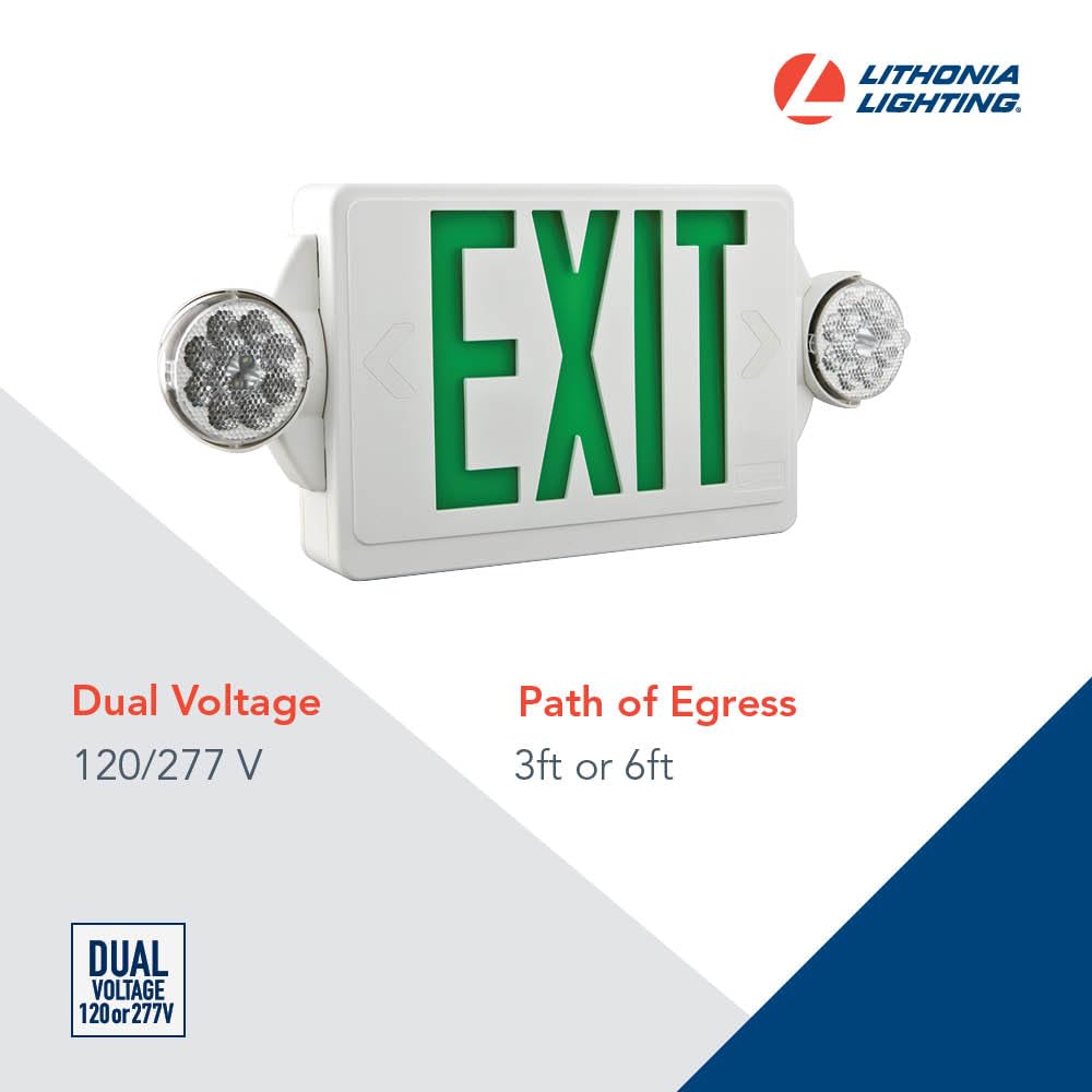 Q: What are the voltage requirements for this exit and emergency light combo?A: The Lithonia Lighting Quantum Combo operates on either 120 or 277 volts at 60 Hz, with an input wattage of 3 watts. This versatility allows it to be used in a variety of commercial settings.