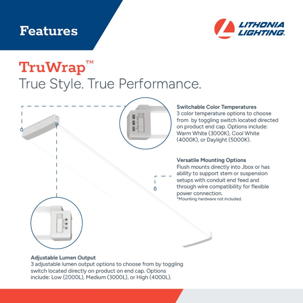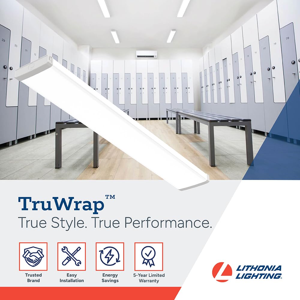 Lithonia Lighting Truwrap 4 Foot Led Ceiling Light Fixture Low-Profile Wraparound Led Shop Light Adjustable Lumens Selectable Warm White/Cool White/Daylight Color Flat Diffuser Narrow Width