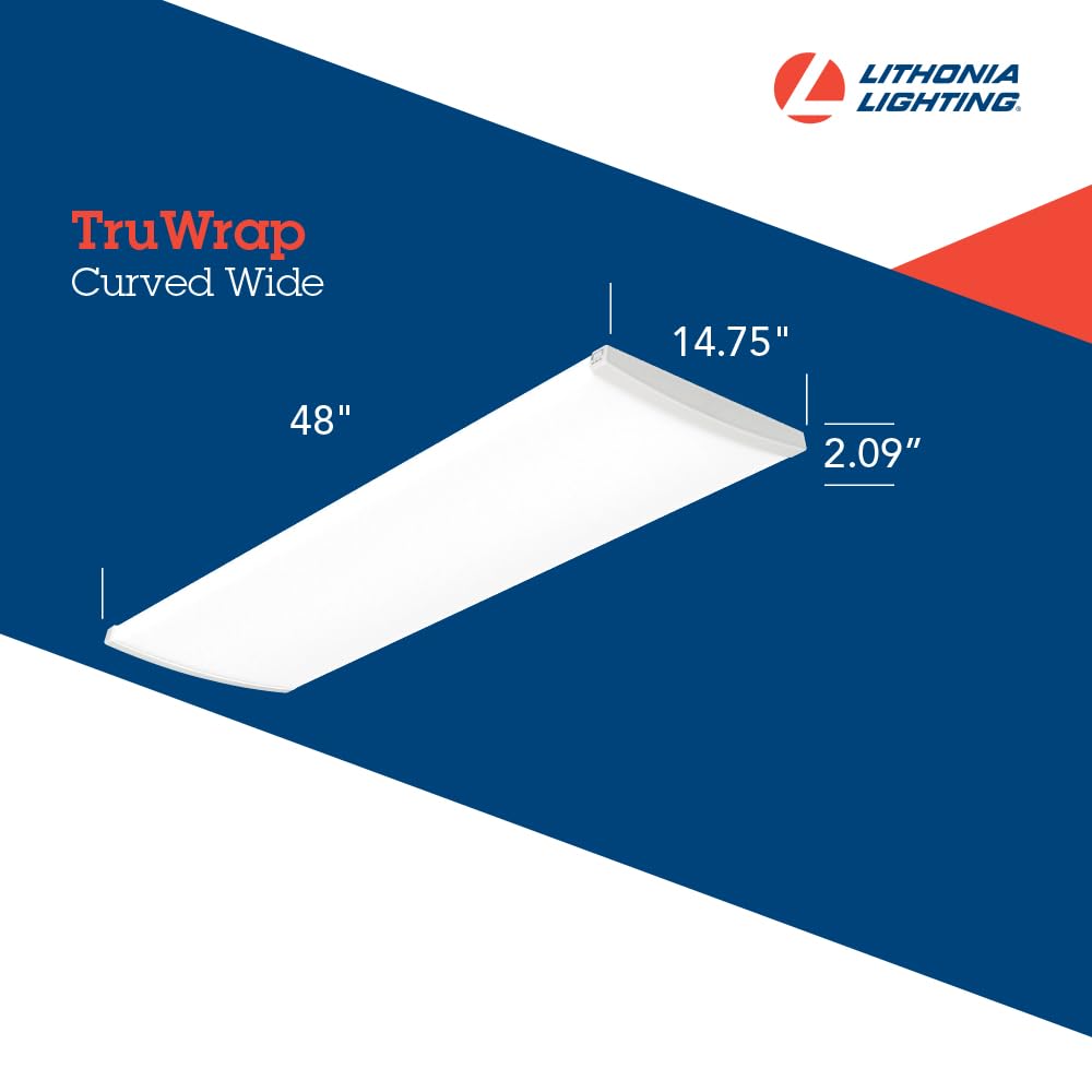 Q: What are the dimensions of the Lithonia Lighting TruWrap LED Ceiling Light?A: The dimensions of the Lithonia Lighting TruWrap LED Ceiling Light are forty-eight inches in length, fourteen and three-quarter inches in width, and two and one-eighth inches in height.