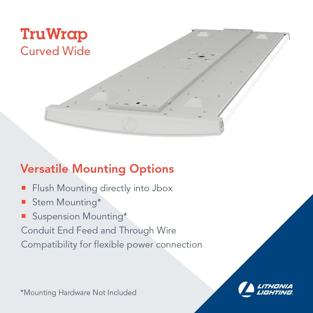Q: What materials are used in the construction of the Lithonia TruWrap light?A: The Lithonia TruWrap features a low-profile metal chassis and a microprismatic polycarbonate curved diffuser designed to provide even light distribution without glare.
