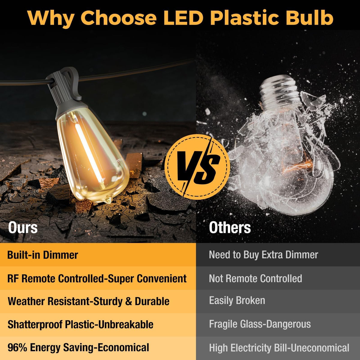 Transform Your Outdoor Space Into A Breathtaking Oasis With Litogo'S Warm White Waterproof String Lights. You'Ll Be Enchanted By The Cozy And Inviting Atmosphere They Create, Making Gatherings, Parties, Weddings, Or Other Events Even More Magical. These Eco-Friendly String Lights With Energy-Efficient Led Bulbs Provide Bright And Vibrant Illumination That Can Withstand Any Weather Conditions With Their Waterproof And Durable Design. Elevate Your Outdoor Space With These Captivating Patio Hanging Lights And Bring Your Vision To Life. Your Guests Will Be Awestruck By Their Stunning Illumination. Made With Durable Materials And A Waterproof Design, These String Lights Are Built To Last And Can Withstand Outdoor Elements Like Rain, Snow, And Humidity For Long-Lasting Use. These Patio Hanging Lights Wtih Rf Remote Are A Stylish And Functional Addition To Your Outdoor Decor, Providing A Cozy And Inviting Atmosphere For Any Occasion, Whether It'S A Special Event Or Everyday Use. Add A Touch Of Charm To Your Home With These Captivating String Lights. Specification: Multi-Function: Remote Controlled With Built-In Dimmer Cable Length:232 Ft Bulb Type: St38 Led Bulbs With E12 Base Quantity: 100+4 Spare Dimension: 1.50 Inch Height: 3.62 Inch Lifespan: 30000 Hours Plug Type: 2-Prong Plug Lighting Color: 2700K Warm White