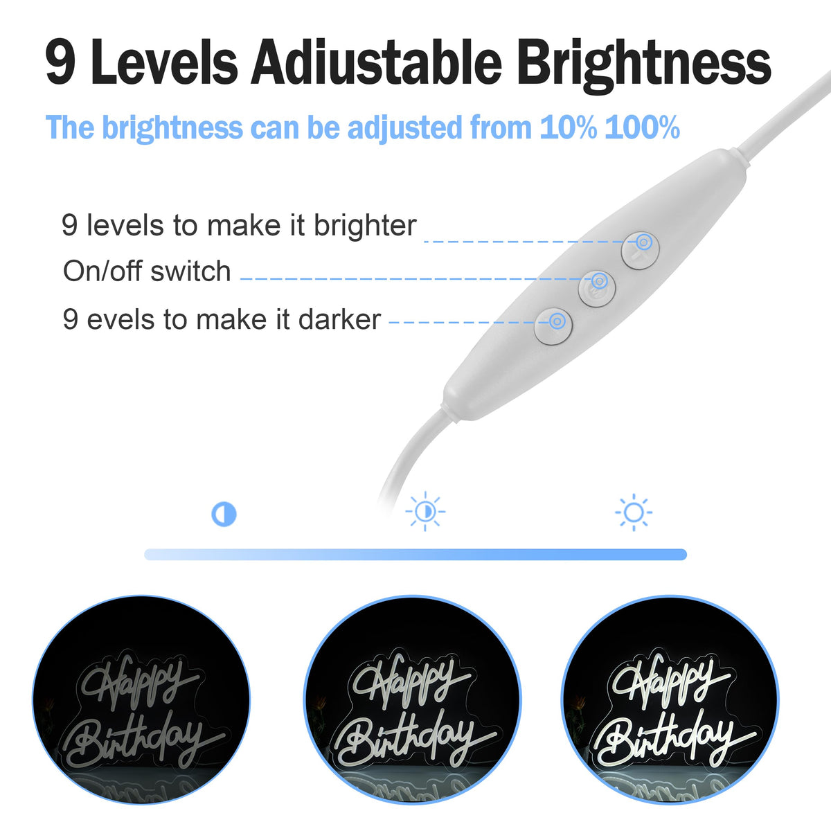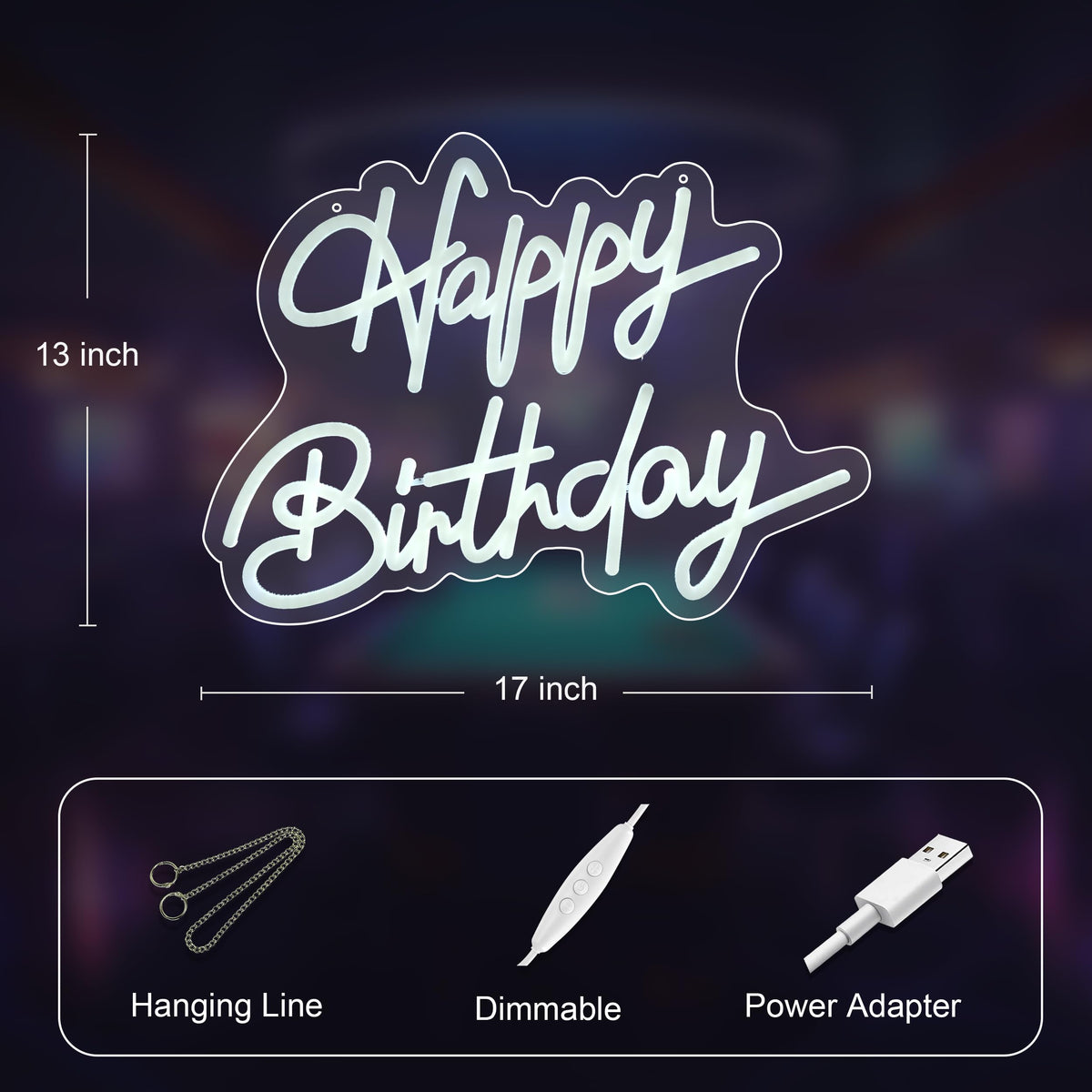 Happy Birthday neon sign Description : Happy Birthday neon signs is a perfect choice to decorate your room for birthday . One year quality warranty . If you have any questions before purchasing or after, please contact us any time , we will reply you as soon as we can. Package Included : 1 x Happy Sign 1 x Birthday Sign 2 x Hanging Chains 1 x Dimmer Switch