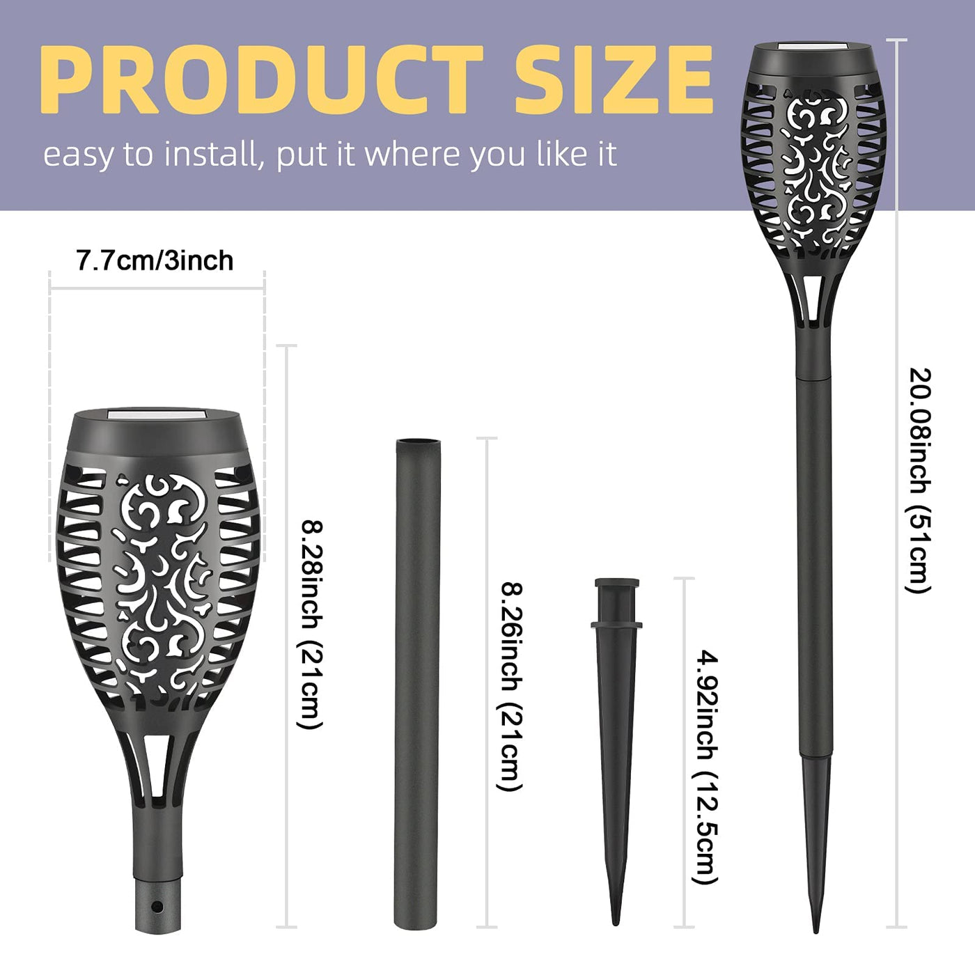 - **Flickering Flame Effect**: Enjoy the ambiance of real flames without the risks. The solar torch lights create a glowing flame effect at night, adding a festive and inviting atmosphere to your outdoor gatherings.