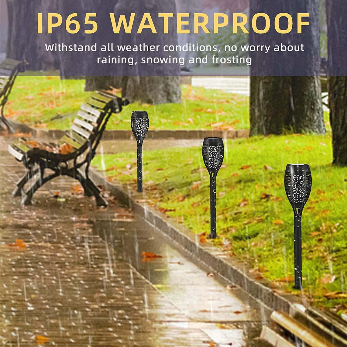 Q: Are these torches waterproof and suitable for all weather conditions?A: Yes, these torches are designed with an IP65 waterproof rating, making them durable and weather-resistant. You can enjoy their warm glow year-round, regardless of the weather.