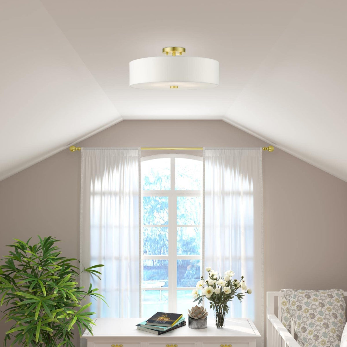 The Meridian collection has a clean, crisp look and contemporary appeal. The hand-crafted off-white fabric hardback shade offers a diffused warm light. This large four-light drum shade adds character to this handsomely styled semi flush mount. Will adapt well in the living room, dining room and bedroom tastefully elevating your style. This sleek design is shown in a satin brass finish.