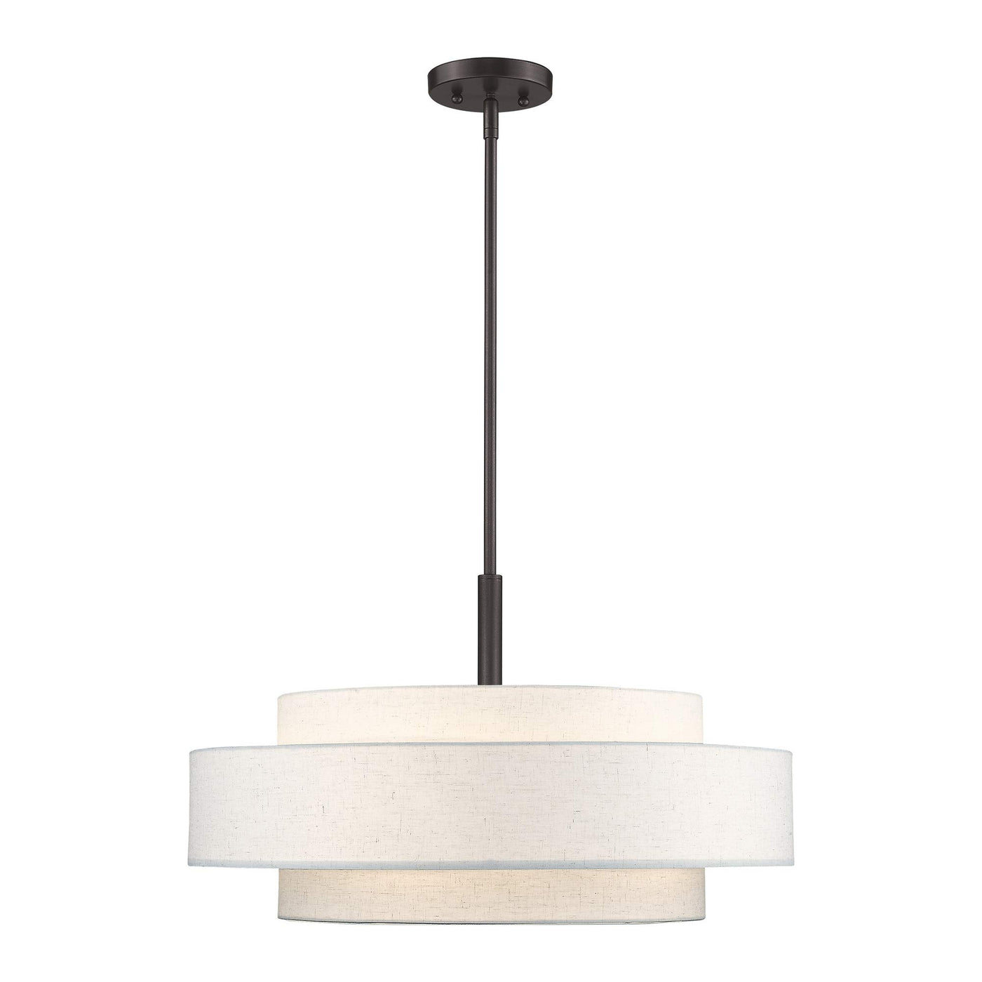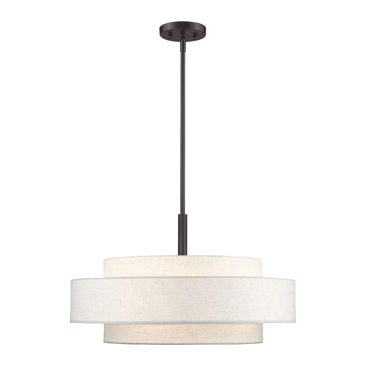 A Triple Drum Shade Adds Character To This Handsomely Styled Pendant Light. Update Your Decor With The Clean Styling Of This Contemporary Five Light Pendant From The Meridian Collection. Features A Lovely Hand Crafted Oatmeal Color Fabric Hardback Shade And Frosted Diffuser For Subtle Illumination.