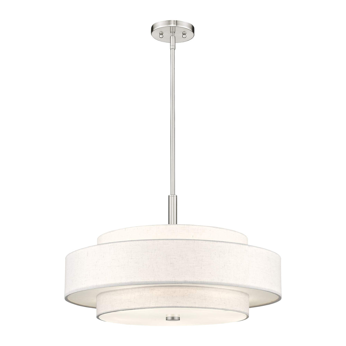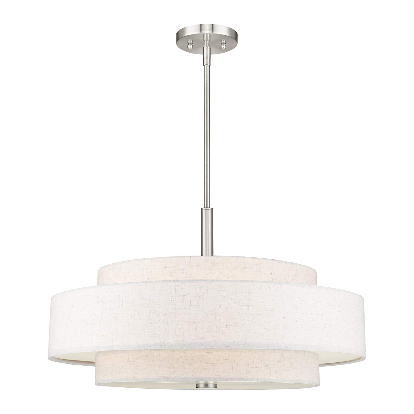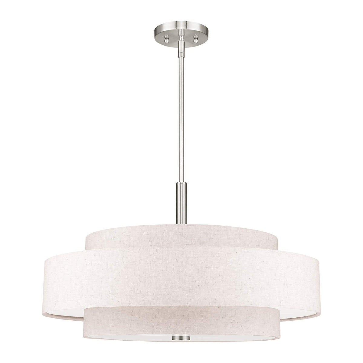 A Triple Drum Shade Adds Character To This Handsomely Styled Pendant Light. Update Your Decor With The Clean Styling Of This Contemporary Five Light Pendant From The Meridian Collection. Features A Lovely Hand Crafted Oatmeal Color Fabric Hardback Shade And Frosted Diffuser For Subtle Illumination.