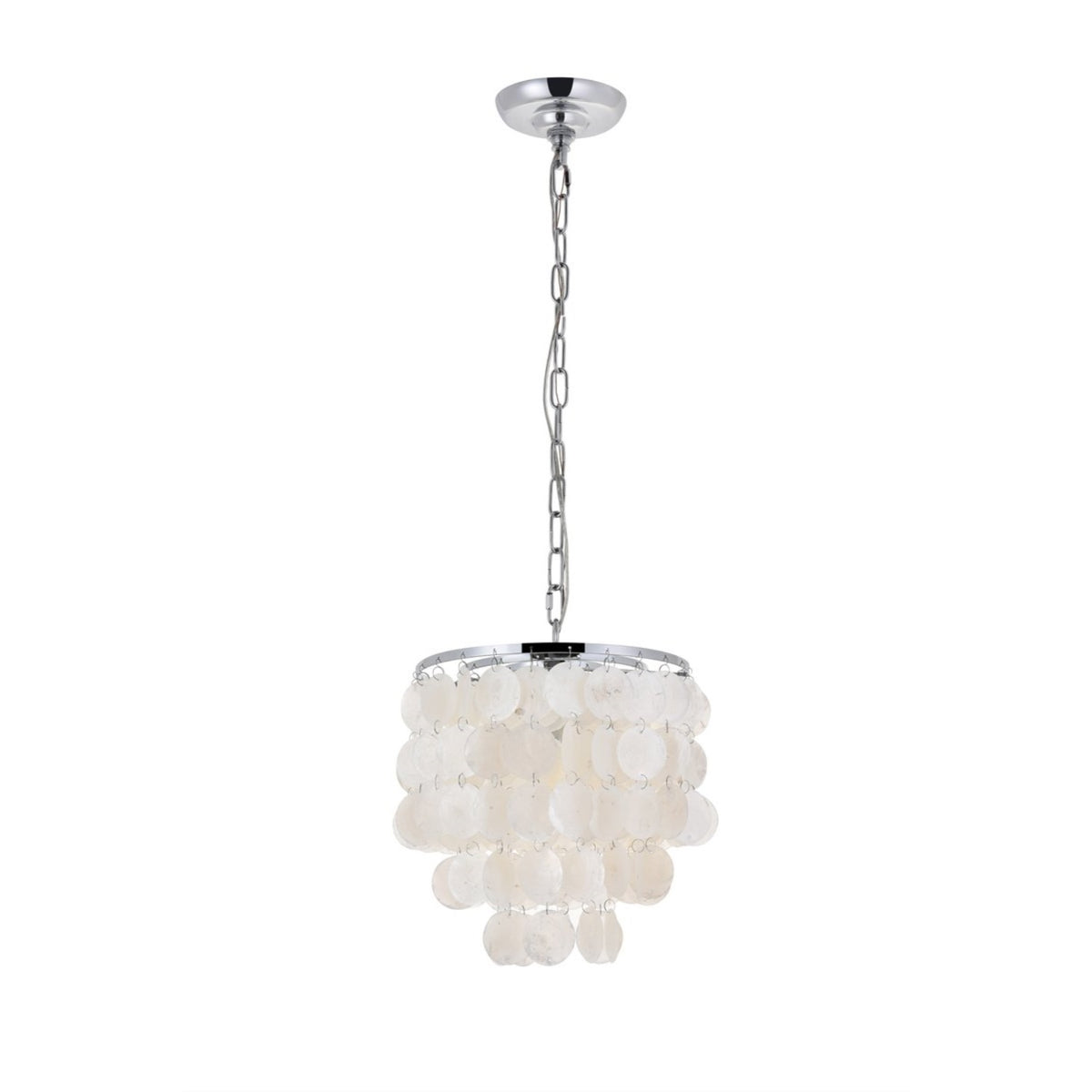 Illuminate your space with the Selene collection pendant lamp, a stunning blend of elegance and modern design. This exquisite lighting fixture, finished in chrome, captures the serene beauty of the moon, bringing a calming ambiance to any room. The tiered arrangement of dreamy off-white shells creates a captivating play of light and shadows, transforming your décor with every subtle flicker. Perfect for a foyer, living room, or child's room, this lamp is more than just a light source; it's a statement piece that enhances your home's aesthetic.