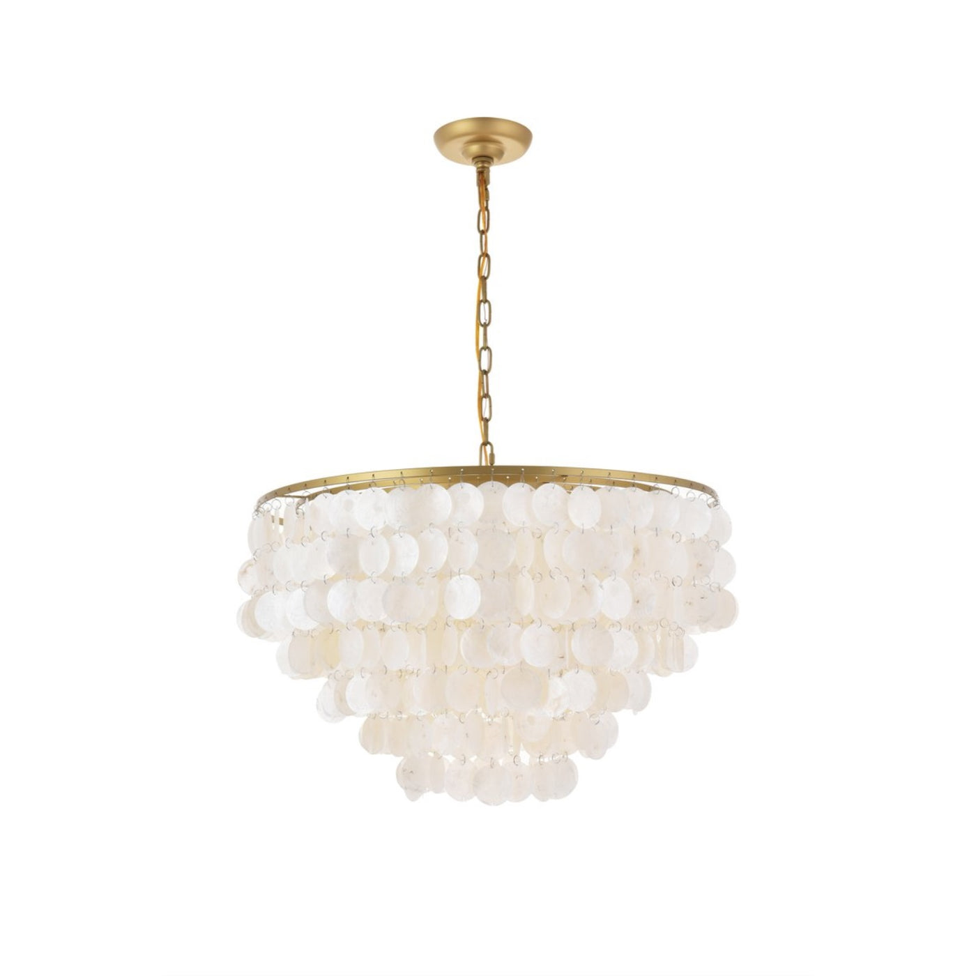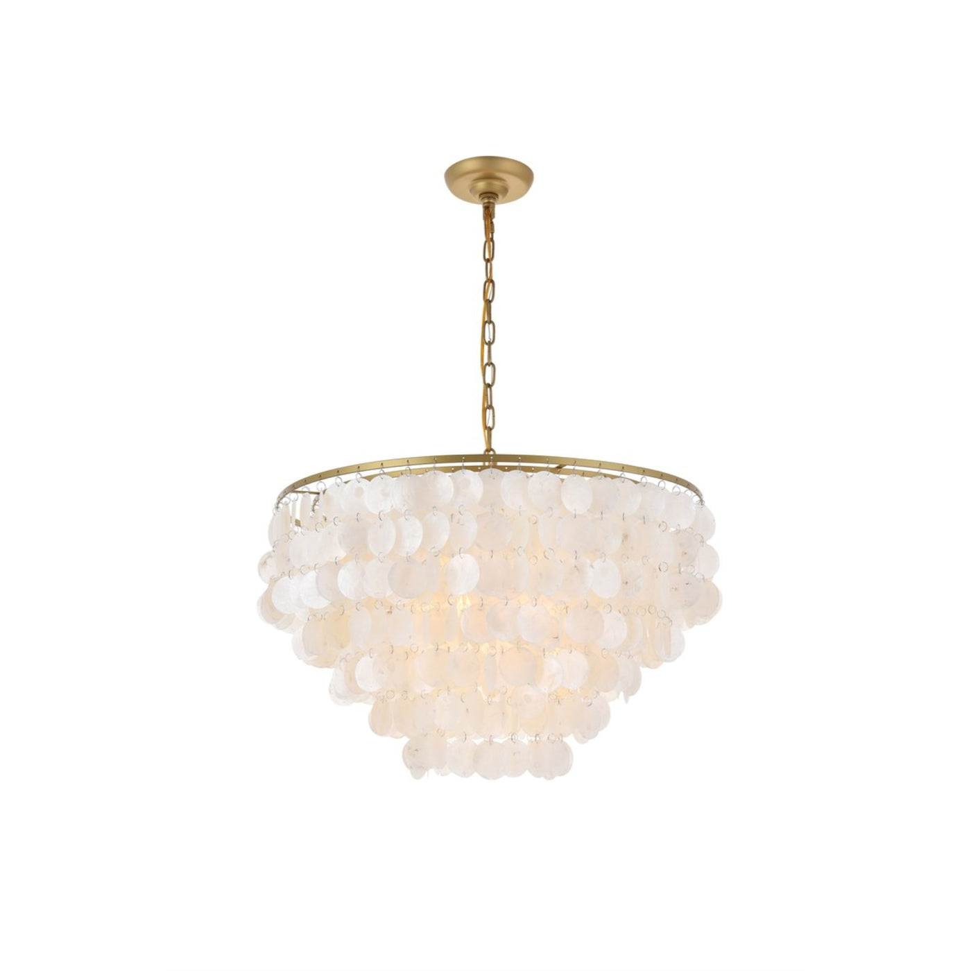 - **Elegant Design**: Features a brass finish with delicate off-white shell tiers that veil the light, offering a soft, soothing illumination reminiscent of moonlight.