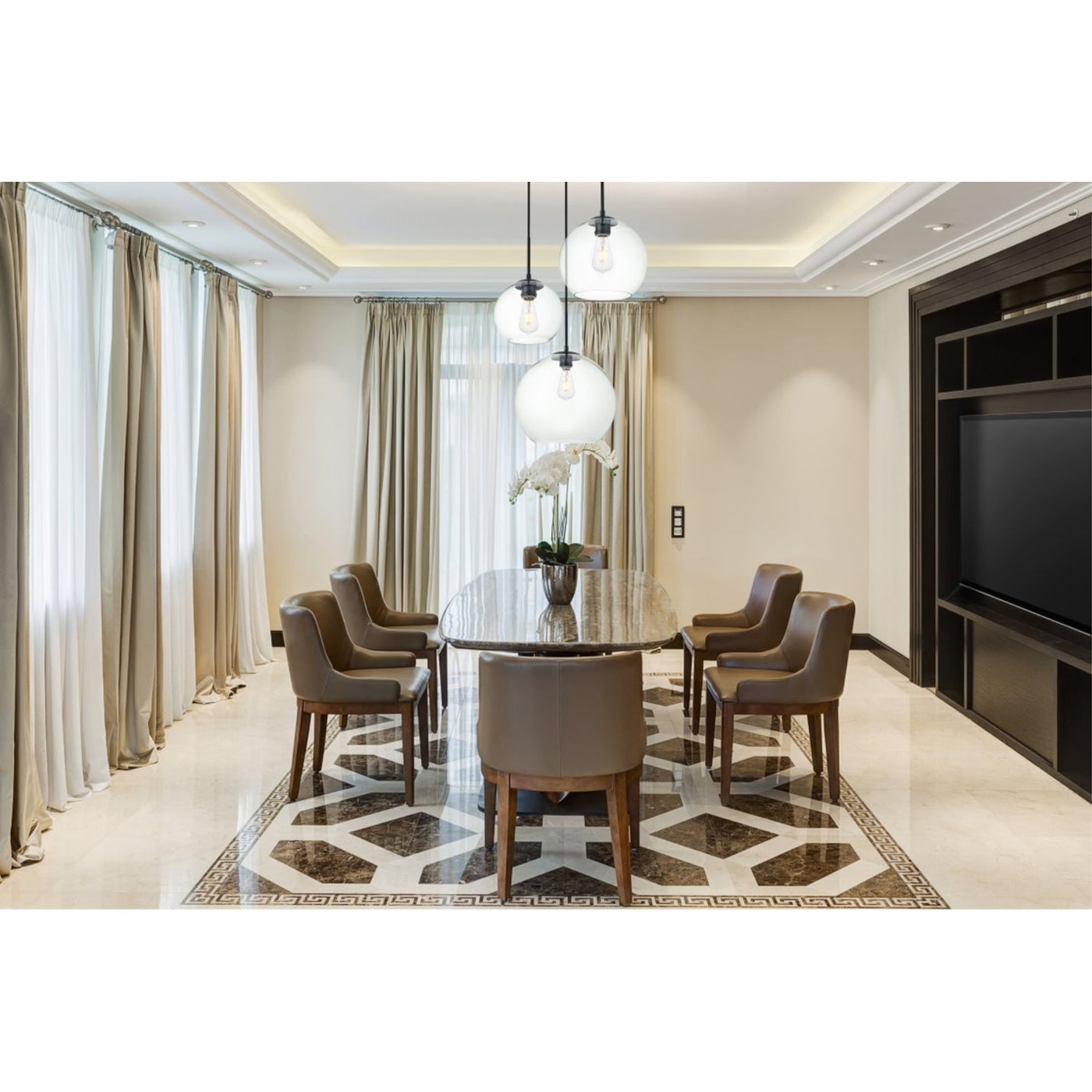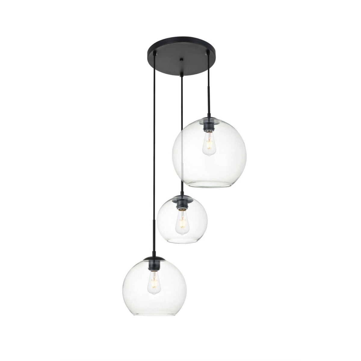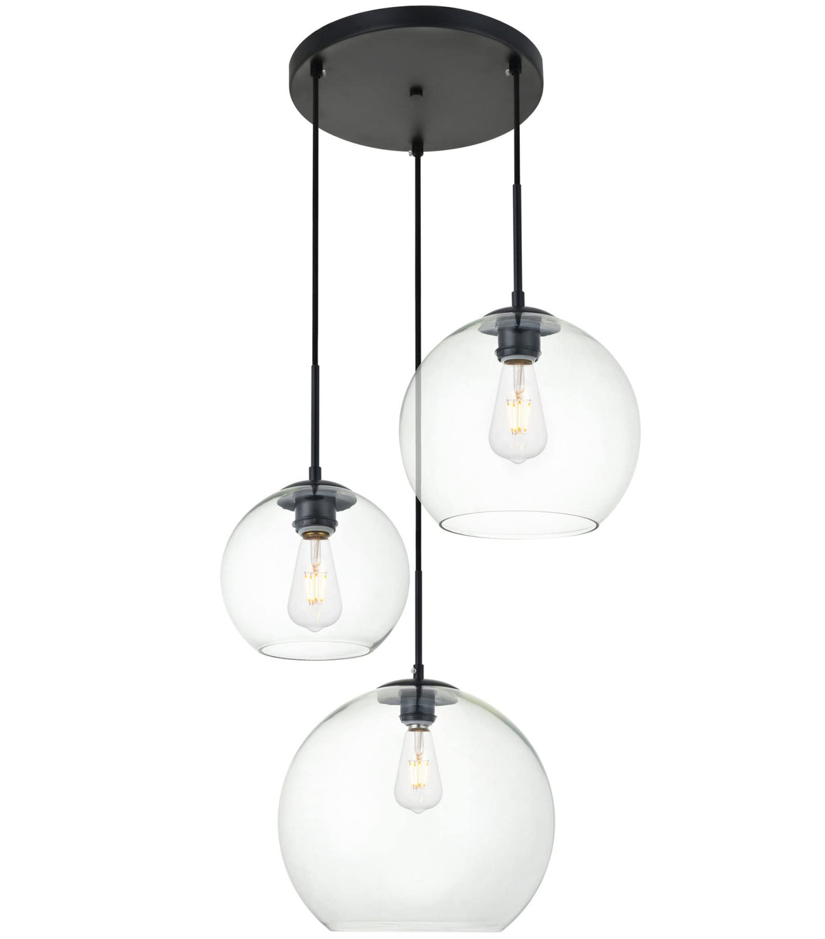 Refined style with a practical design, Baxter hanging pendant lamps bring cosmopolitan sophistication anywhere, especially to an entryway, office, bathroom, bedroom, or kitchen. The smooth iron frame features a disk-shaped canopy and comes in a black finish. Adjustable black cords allow you to modify the hanging height from 18 to 87 inches. Three clear spherical glass shades of different sizes are suspended at varying heights and remain open at the center to allow for effortless replacement of the filament-style bulbs (not included). Living in the big city has never been this easy.Features:Materials: Iron, GlassFinish: Black, clearThree different-sized spherical clear glass shades with open center for easy bulb replacementTotal lamp width of 20.9 inches with shade widths of 7.9/9.8/11.8 inches and shade heights of 7.1/8.9/10.6 inchesRequires an incandescent or led e26 bulb (not included)Clean sleek designSpecifications:Product Dimensions: 11.8"H x 20.9"W x 20.9"DProduct Weight: 8.3 lbsHardware: Fixture Shape - PendantBulb Type: Bulb Socket - E26Voltage: 110V - 125VWattage: Bulb Wattage - 40W, Max Wattage - 120WHardware: 79" of Black Wire IncludedAdjustability: Not Height AdjustableNumber of Lights: 3Product Height: Hanging Height - 18" Min to 87" Max