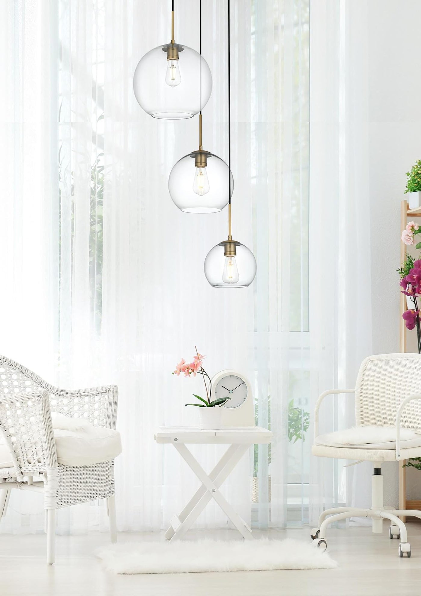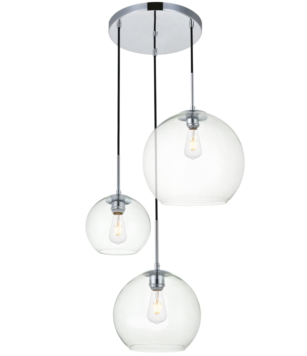Refined style with a practical design Baxter hanging pendant lamps bring cosmopolitan sophistication anywhere especially to an entryway office bathroom bedroom or kitchen. The smooth iron frame features a disk-shaped canopy and comes in a chrome finish. Adjustable black cords allow you to modify the hanging height from 18 to 87 inches. Three clear spherical glass shades of different sizes are suspended at varying heights and remain open at the center to allow for effortless replacement of the filament-style bulbs (not included). Living in the big city has never been this easy.Features:Materials: Iron GlassFinish: Chrome clearThree different-sized spherical clear glass shades with open center for easy bulb replacementTotal lamp width of 20.9 inches with shade widths of 7.9/9.8/11.8 inches and shade heights of 7.1/8.9/10.6 inchesRequires an incandescent or led e26 bulb (not included)Clean sleek designSpecifications:Product Dimensions: 11.8''H x 20.9''W x 20.9''DProduct Weight: 8.3 lbsHardware: Fixture Shape - PendantBulb Type: Bulb Socket - E26Voltage: 110V - 125VWattage: Bulb Wattage - 40W Max Wattage - 120WHardware: 79'' of Black Wire IncludedAdjustability: Not Height AdjustableNumber of Lights: 3Product Height: Hanging Height - 18'' Min to 87'' Max