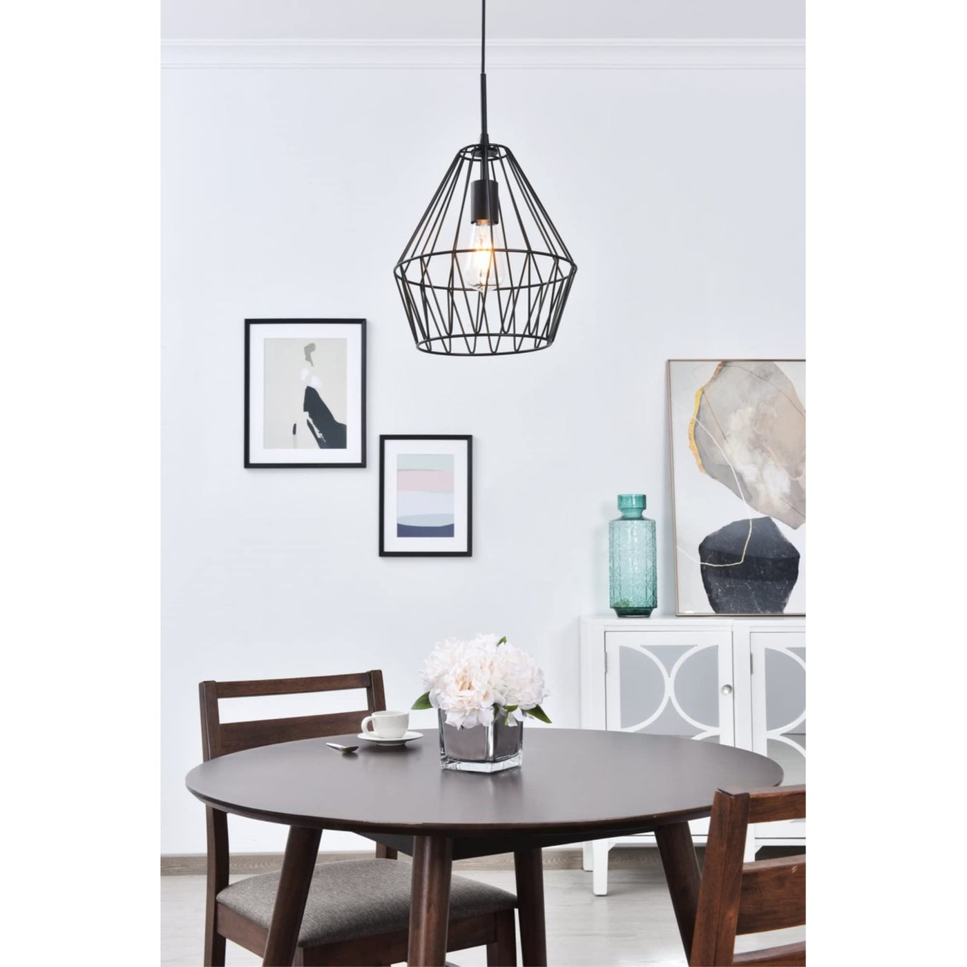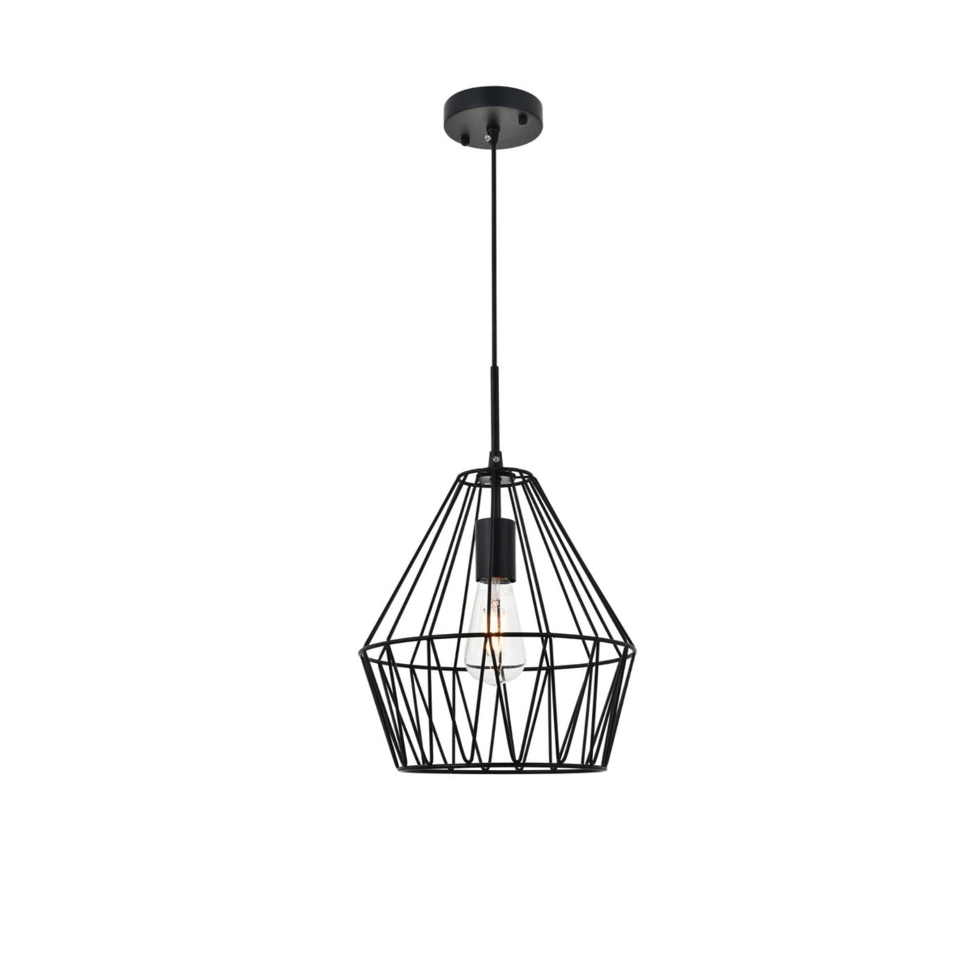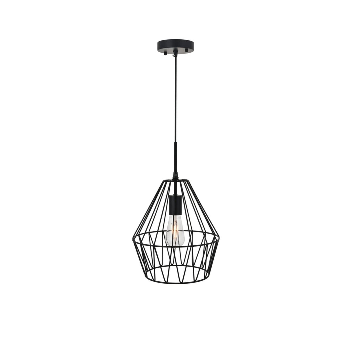 The Candor collection pendant is just as open and honest as the lively geometric black finish cage shade. Allowing for light to playfully shine through, the shadows casted will add to its splendid charm. Whether it illuminates your living room or foyer, its beautiful design will surely surprise and amuse your guests.Features:Materials: MetalFinish: BlackHanging black finish pendant with a contemporary open geometric shadeRequires 1 e26 bulbs (bulbs not included)Open geometric black finish metal shadeSuspended from a black finish adjustable cordCord length: 59''Minimum hanging height: 25''; maximum hanging height: 78''Specifications:Product Dimensions: 13.2''H x 11.2''W x 11.2''DProduct Weight: 2.2 lbsHardware: Fixture Shape - PendantBulb Type: Bulb Socket - E26Voltage: 110V - 125VWattage: Bulb Wattage - 40W, Max Wattage - 40WHardware: 59'' of black Wire IncludedAdjustability: Not Height AdjustableNumber of Lights: 1Product Height: Hanging Height - 25'' Min to 78'' Max