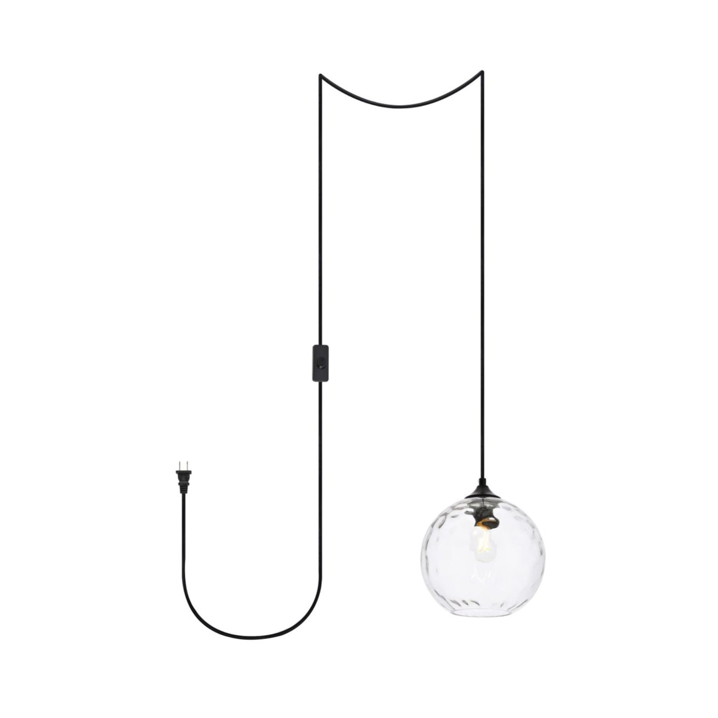 Enjoy whimsy and airy modernity with this Cashel Collection pendant. Reminiscent of dreamy bubbles being dispersed on a summer's day, the clear glass sphere design will add lovely illumination while not cluttering the design and style of your room. Versatile and subtle, this will create a delightful breezy style to any room, whether its your bathroom, child's playroom, or dining room (light bulbs not included). Plug-in design for easy access lighting with built-in on/off switch. Simply hang this piece on the provided swag hooks and plug it in for an effortlessly easy installation - can be hung from a sloped or vaulted ceiling.Features:Materials: Iron metal, glassFinish: BlackSpherical hammered clear glass shade with open center in black finishPlug-in design for easy access lighting with built-in on/off switchSpecifications:Product Dimensions: 9"H x 8"W x 8"DProduct Weight: 1.98 lbsHardware: Fixture Shape - Plug In PendantBulb Type: Bulb Socket - E26Number of Lights: 1Voltage: 110V - 125VWattage: Bulb Wattage - 40W, Max Wattage - 40WHardware: 181" of black wire includedAdjustability: Height AdjustableProduct Height: Hanging Height - 14.8" Min to 68.8" Max