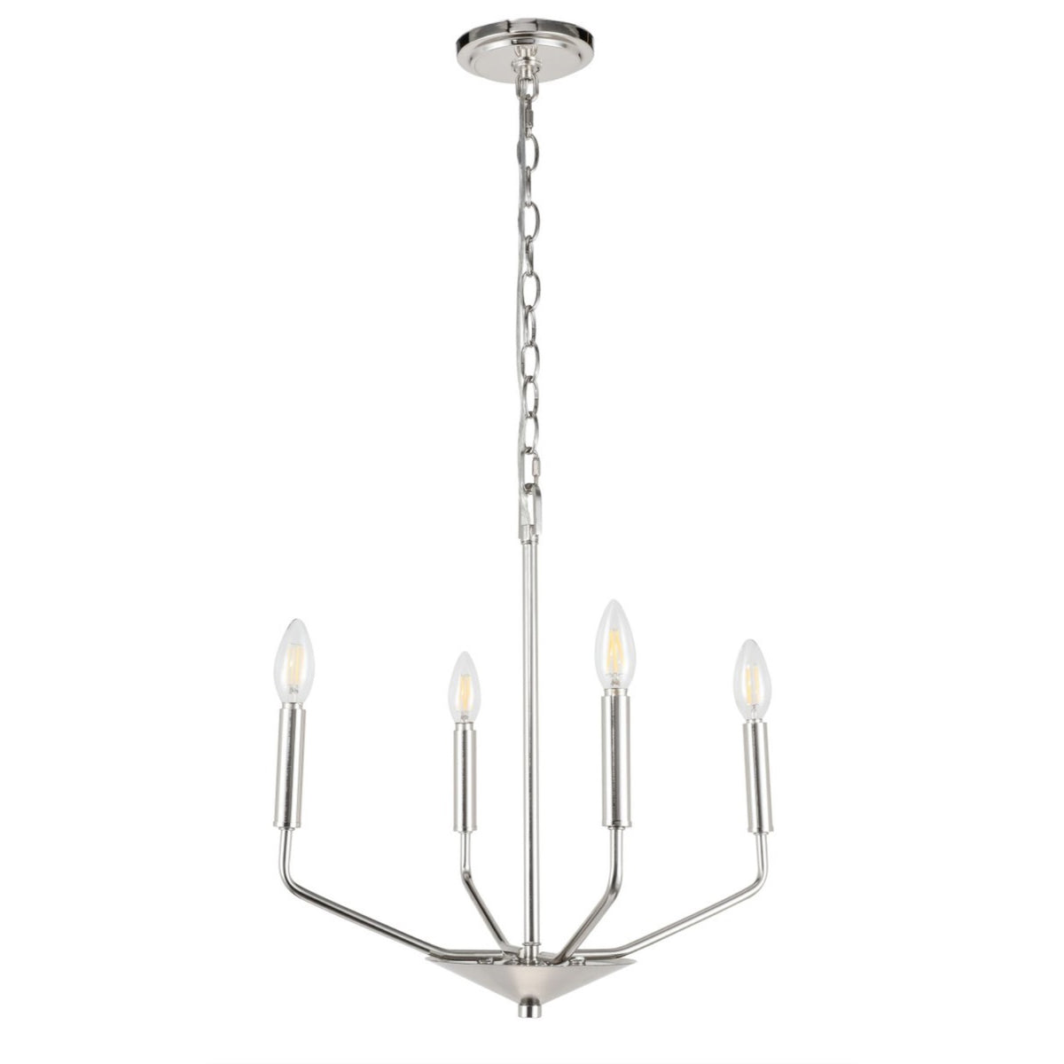 Q: What type of light bulbs are compatible with the Enzo 4 Light Chrome Pendant?A: The Enzo 4 Light Chrome Pendant is compatible with LED E12 light bulbs, which are not included with the fixture. For optimal performance, it is recommended to use bulbs with a maximum wattage of 60W each.