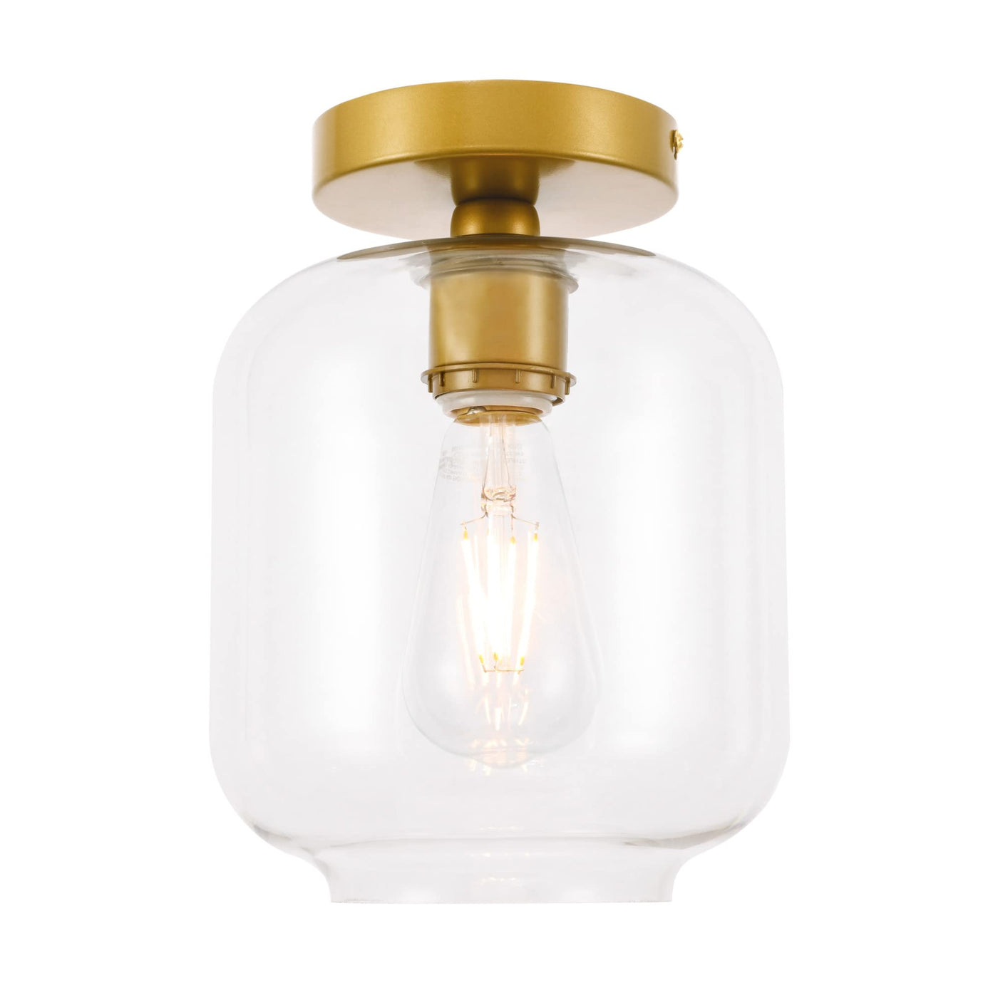 The Collier Collection of lights will be sure to have your guests admire your modern sense of style with the beautiful simplicity of its shape and form. This flush mount allows brilliant illumination to shine and radiate, allowing for your room to be center stage, and despite its minimalism, its design is far from boring--available in a brass, chrome, or black finish, with either a clear or frosted cylinder glass shade. The sleek organic curves of the mount and the cylinder that encapsulates the bulb will enhance your bathroom, foyer, or hallways, allowing for you to always live a chic and fashionable lifestyle, no matter where you are (light bulbs not included).Features:Material: Metal (Iron), GlassFinish: Brass, ClearRoom of Use: Hallway, living room, bedroom, bathroom, entry wayCanopy included: YesShade included: YesLight Direction: DownBulbs included: NoDimmable: YesNumber of Tiers: 1Dry locationClean sleek lines and a minimalistic design that is a versatile fit for any aestheticClear glass cylinder shaped shadeEasily mounted on ceilingSpecifications:Product Dimensions: 10"H x 7.3"W x 7.3"DProduct Weight: 1.85 lbsProduct Dimensions: (Shade) 8.1"H x 7.3"WProduct Dimensions: (Canopy) 1"H x 4.7"W x 4.7"DBulb Type: (Bulb Socket) E26Number of Lights: 1Voltage: 110-125VWattage: (Bulb) 40WWattage: (Maximum) 40WHardware: 11" of black and white wire