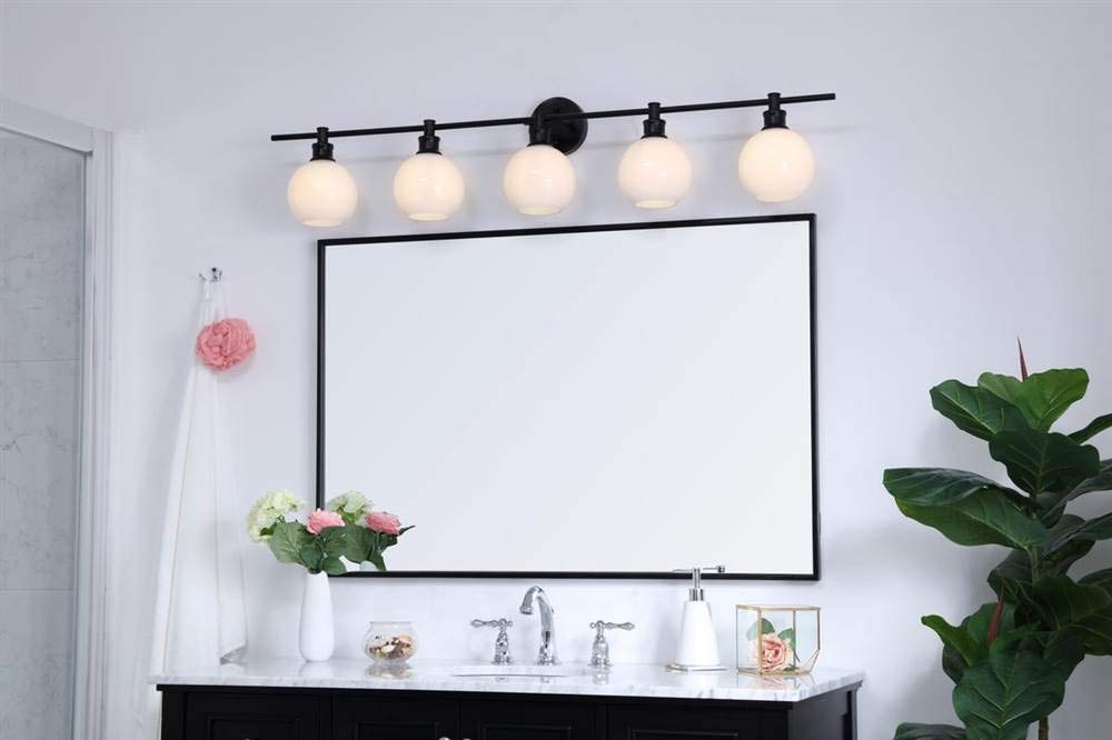 The Collier Collection of lights will be sure to have your guests admire your modern sense of style with the beautiful simplicity of its shape and form. The clean lines of the ball shaped shades create the juxtaposition of intricate simplicity achieving a style that has both form and function. This wall lamp can be oriented facing up or down but will always illuminate your room. Available in a brass chrome or black finish with either a clear or frosted ball glass shade it is the perfect wall lamp to enhance your bathroom foyer or hallways allowing you to always live a chic and fashionable lifestyle (light bulbs not included).Features:Materials: Iron metal glassFinish: Black frosted white glassClean sleek lines and a minimalistic design that is a versatile fit for any aestheticFrosted white glass ball shaped shadeEasily mounted on wallLight bulb type: LED E26 (not included)Specifications:Product Dimensions: 9.8''H x 8''W x 47''DProduct Weight: 7.17 lbsHardware: Fixture Shape - Bath SconcesBulb Type: Bulb Shape - ST18 Bulb Socket - E26Number of Lights: 5Voltage: 110V - 125VWattage: Bulb Wattage - 40W Max Wattage - 200WHardware: 11'' of black & white wire includedAdjustability: Not Height Adjustable