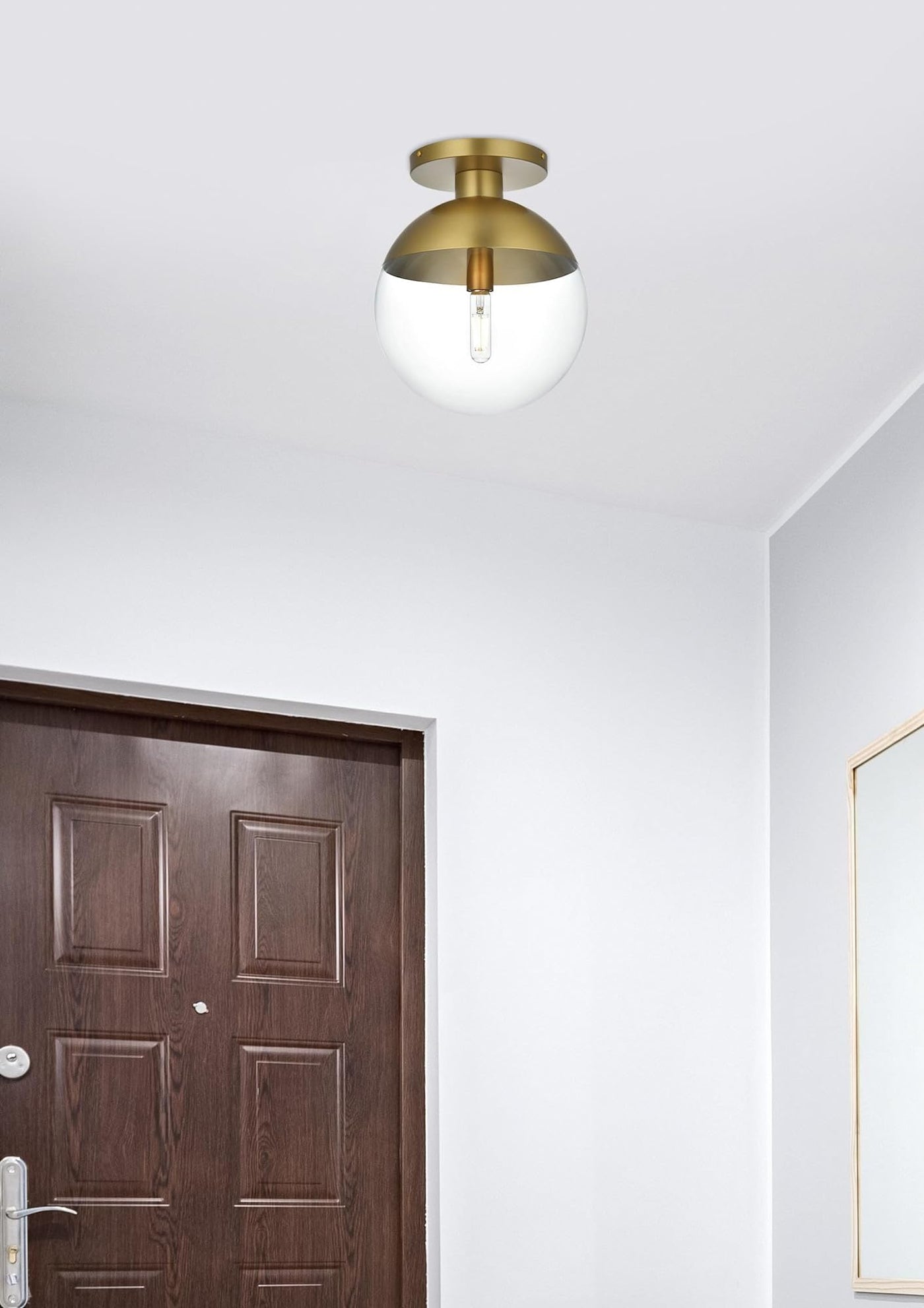 Refined style with a practical design, Eclipse flush mount bring cosmopolitan sophistication anywhere, especially to an entryway, office, bathroom, bedroom, or kitchen. The smooth iron frame features a disk-shaped canopy and comes in a brass finish. A touch of color on top of the clear spherical glass shade brings character to this classic style. Living in the big city has never been this easy.