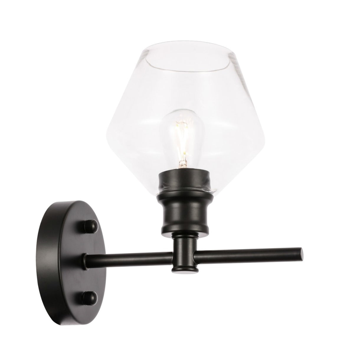 Product Specifications: SKU: LD2308BK Finish: Black Manufactured By: Elegant Lighting Backplate Depth: 1 in. Backplate Height: 4.7 in. Backplate Width: 4.7 in. Extension: 9.2 in. Height: 10.2 in. Nominal Height: 10 in. Shade Depth: 6 in. Shade Height: 5.5 in. Shade Width: 6 in. Width: 6 in. Bulb Included: No Swing Arm: No Bulb Base: Medium (E26) Dimmable: Yes Full Backplate: No Genre: Industrial, Transitional Glass Features: Clear Glass Light Direction: Up Lighting Material: Iron Number of Bulbs: 1 Reversible Mounting: Yes Sconce Type: Upward Arm Shade Color: Clear Shade Material: Glass Shade Shape: Tapered Plug In: No Power Source: Hardwired Voltage: 110, 125 Wattage: 40 Watts Per Bulb: 40 ADA: No Collection: Gene Country Of Origin: China Energy Star: No ETL Listed: Yes Location Rating: Dry Location