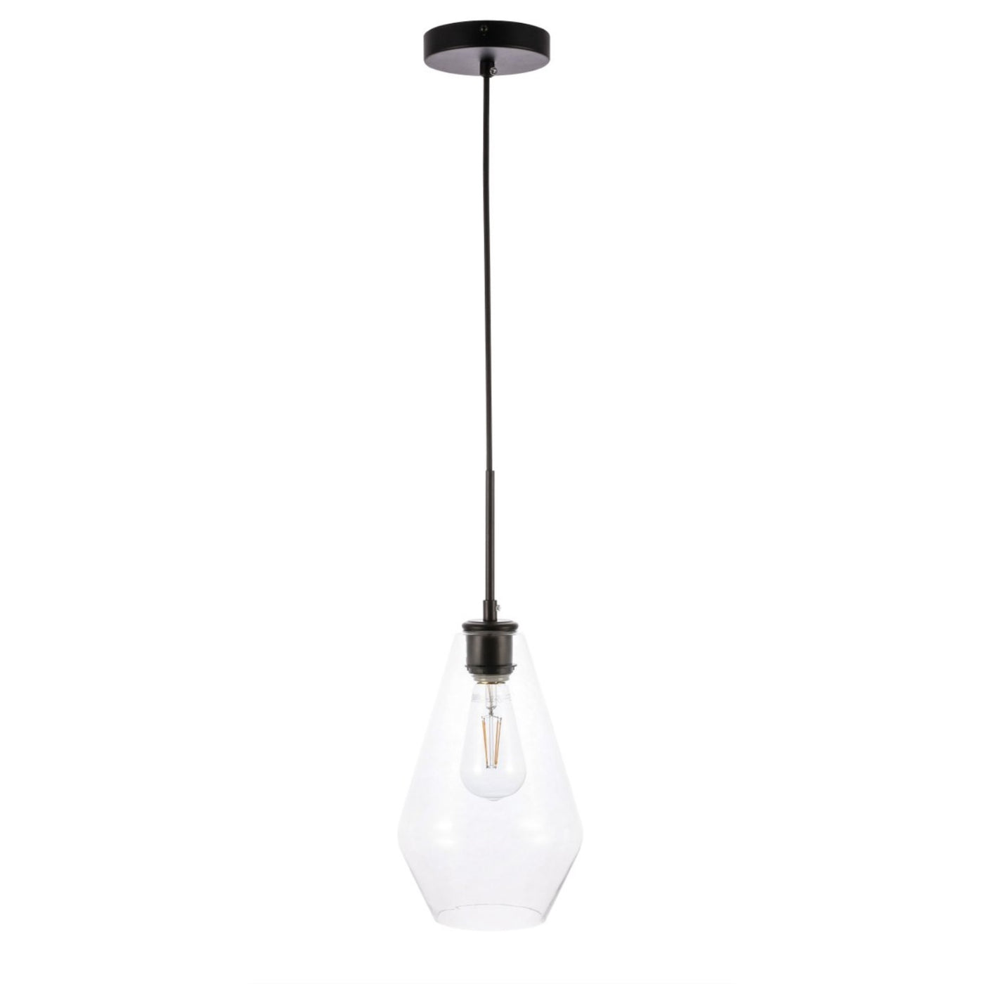 The Gene Collection of lights will be sure to have your guests admire your modern sense of style with the beautiful simplicity of its shape and form. From the solidity of the hanging cord to the clean lines that the diamond shaped shade creates, this pendant will create drama and beauty in any room of your home. Its design is both minimal enough to not take away from your style in large rooms, and stylish enough to add character in smaller spaces. Available in a brass, chrome, or black finish, with either a clear or frosted diamond glass shade, enhance your dining room, living room, or bedroom with the Gene Collection hanging pendant and live in sleek contemporary style (light bulbs not included).Features:Materials: Iron, GlassFinish: Black, clearClean sleek lines and a minimalistic design that is a versatile fit for any aestheticClear glass diamond shaped shade1 light that illuminates downwards; dimmableSuspended from a canopy with an adjustable cordLight bulb type: led e26 (not included)Specifications:Product Dimensions: 12.2"H x 7.1"W x 7.1"DProduct Weight: 2.01 lbsHardware: Fixture Shape - PendantBulb Type: Bulb Socket - E26Voltage: 110V - 125VWattage: Bulb Wattage - 40W, Max Wattage - 40WHardware: 60" of Black Wire IncludedAdjustability: Height AdjustableNumber of Lights: 1Product Height: Hanging Height - 18.2" Min to 72.2" Max