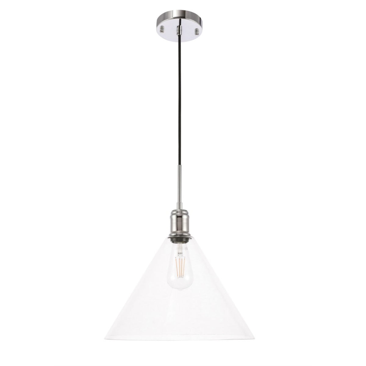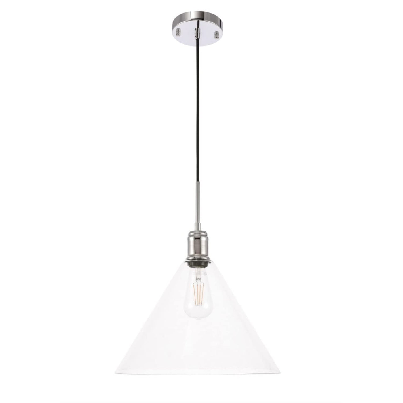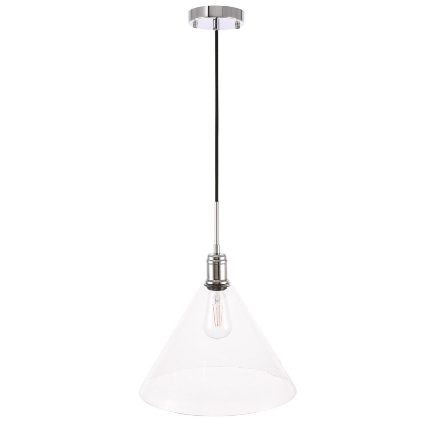 Living District LD6229C Hugh 1 light Chrome and Clear glass pendant. Finish(color): Chrome and Clear glass. Hardware Finish: Chrome. Distressed Finish: no. Hand Painted: no. Hardware Material: Metal. Fixture Material: Metal and Glass. Dimension(in): 13.75(L) x 13.75(W & Dia) x 12.6(H). Shade Dimension(in): 13.75(W) x 9.5(H). Canopy Dimension(in): 4.8(W) x 1(H). Assembly Required: NO. Shade Material: Glass. Shade Color: Clear. Shade Shape: Round. Min/Max Height(in): 18.5/72.5. Height is Adjustable?: yes. Hanging Device Adjustable (Y/N):YES. Type of Hanging Device: Black fabric cord. Wire color: Black. Bulb: (1)40W E26 Base(Not Included),Dimmable. Max Wattage: 40W. Voltage: 110-125V. Listing: UL,ULC,Dry. Product Warranty: 1 year.