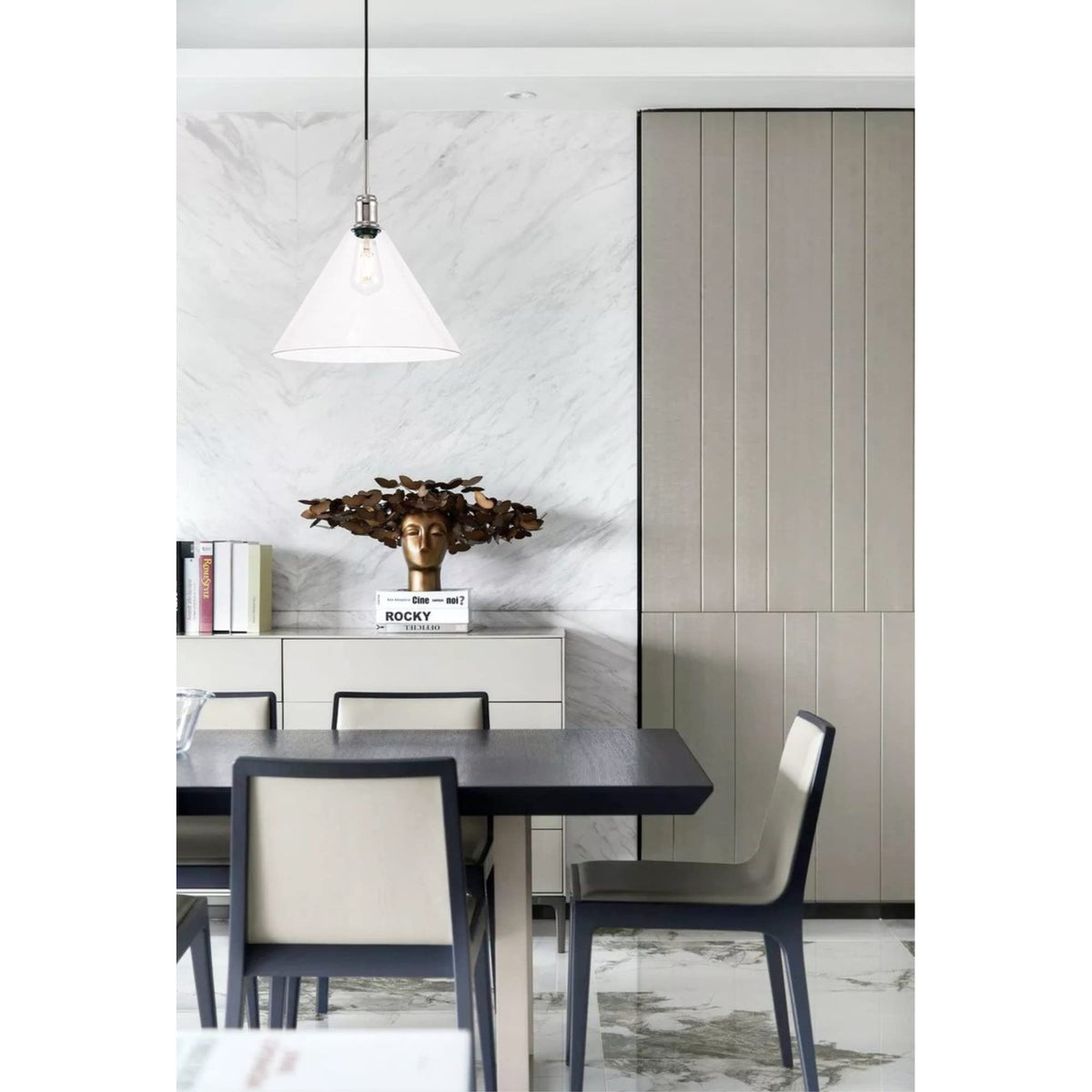 Q: What materials are used in the construction of this pendant light?A: The Living District Hugh Pendant is made of metal and glass, featuring a chrome finish with a clear glass shade.