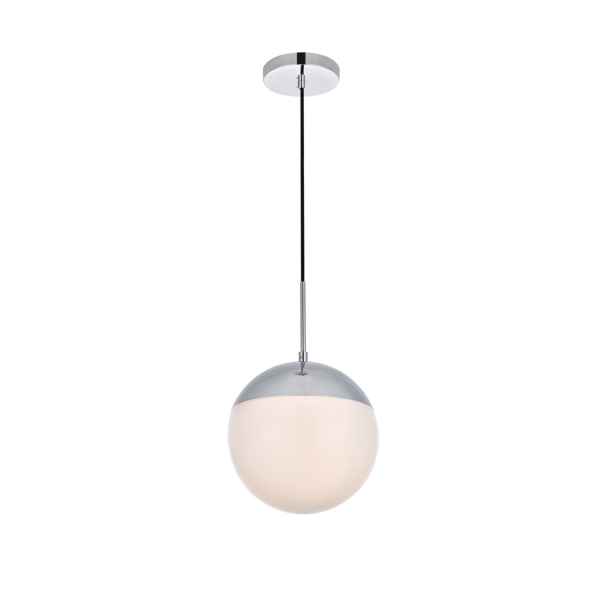 Refined style with a practical design, Eclipse hanging pendant lamps bring cosmopolitan sophistication anywhere, especially to an entryway, office, bathroom, bedroom, or kitchen. The smooth iron frame features a disk-shaped canopy and comes in a chrome finish. An adjustable black cord allows you to vary the hanging height from 18 to 65 inches. A touch of color on top of the frosted white spherical glass shade brings character to this classic style. Living in the big city has never been this easy.Pendant lamp features a chrome and frosted white glass. Glass shade width of 10 inches with a height of 9.5 inches. Decorative chrome 'top hat' caps the shade. Requires an incandescent or LED E26 bulb (not included). no assembly required. clean sleek design.