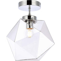 - Materials: Iron metal, glass - Finish: Chrome, clear - Features a round canopy and a clear multi-sided glass shade - Semi-flush mount height is fixed - Illuminated by 1 E26 base light bulb; bulbs are not included - Perfect for lighting over hallways, closets, bathrooms, and bedrooms - Lighting is compatible with LED bulbs and is dimmable.