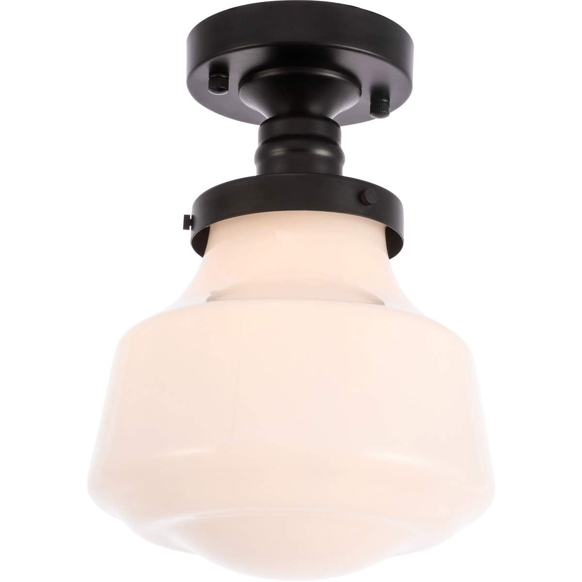 The Lyle Collection is a stunningly functional, yet simplistically lovely light. The geometric shade creates a clean form that will fit well in any space, large or small. Its versatile simplicity allows for this fixture to blend in well with the rest of your room, while still maintaining its own bright personality. Available in a black, chrome, or brass finish, and a clear bubble or frosted white shade, let this ceiling lamp illuminate your room (light bulbs not included).Features:- Material: Metal, Glass- Finish: Black, Frosted White- Room of Use: Living room, dining room, kitchen, bar- Canopy included: Yes- Shade included: Yes- Light Direction: Down- Bulbs included: No- Dimmable: Yes- Number of Tiers: 1- Dry location- Modern day farmhouse rustic style- Frosted white schoolhouse shaped shade- Easily mounted on ceilingSpecifications:- Product Dimensions: 11H x 8W x 8D- Product Weight: 2.4 lbs- Product Dimensions: (Shade) 7.5H x 8W- Product Dimensions: (Canopy) 1H x 4.8W- Bulb Type: (Bulb Socket) E26- Number of Lights: 1- Voltage: 110-125V- Wattage: (Bulb) 40W- Wattage: (Maximum) 40W- Hardware: 10 of black and white wire