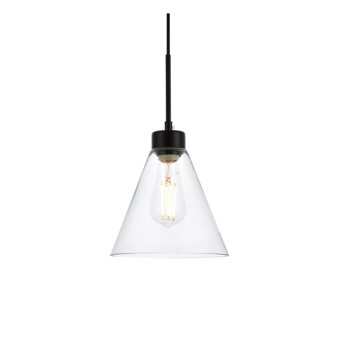 The Mera Collection pendant light is a refined accent piece to have. The cone shaped glass shade and straight cord will fit seamlessly to any room. Available in a black or brass finish this light will illuminate its surrounding. This product is dimmable, requires one E26 socket. Light bulbs not included.Features:Materials: Iron metal, glassFinish: Black, clearFeatures a round canopy and an adjustable hanging cordIlluminated by 1 E26 base light bulb; bulbs are not includedOpen bottom of the shade for convenient access to change light bulbsAdjustable cord up to 59 inchLighting is compatible with LED bulbs and is dimmableSpecifications:Product Dimensions: 9.1"H x 7.9"W x 7.9"DProduct Weight: 2.2 lbsHardware: Fixture Shape - PendantBulb Type: Bulb Socket - E26Number of Lights: 1Voltage: 110V - 125VWattage: Bulb Wattage - 40W, Max Wattage - 40WHardware: 59" of black wire includedAdjustability: Not Height AdjustableProduct Height: Hanging Height - 16.1" Min to 69.1" Max