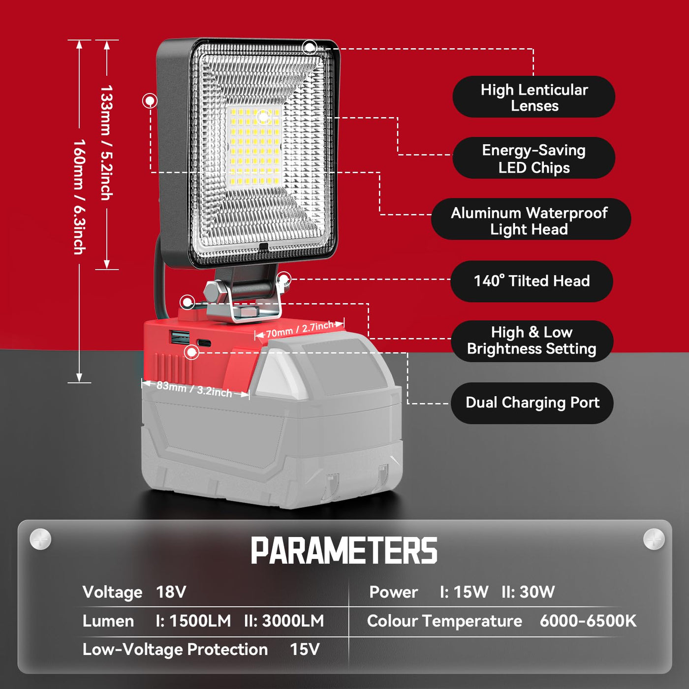 Livowalny 18V Work Light For Milwaukee 18V Battery, 30W 3000Lm Cordless Battery Light, Led Flood Light Flashlight Tools 140? Adj