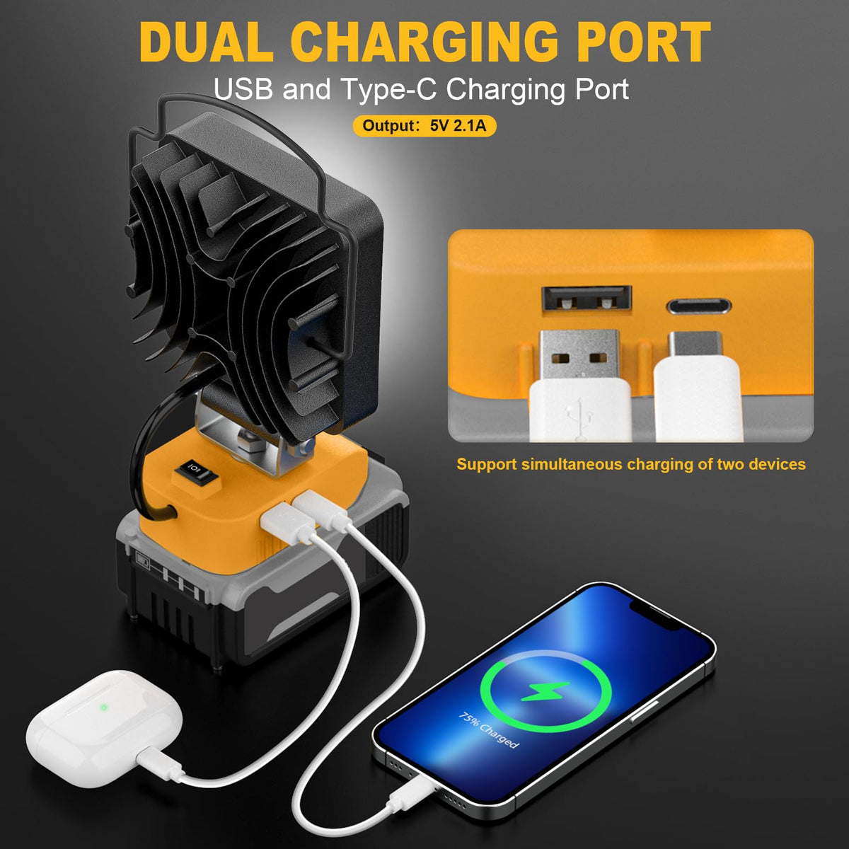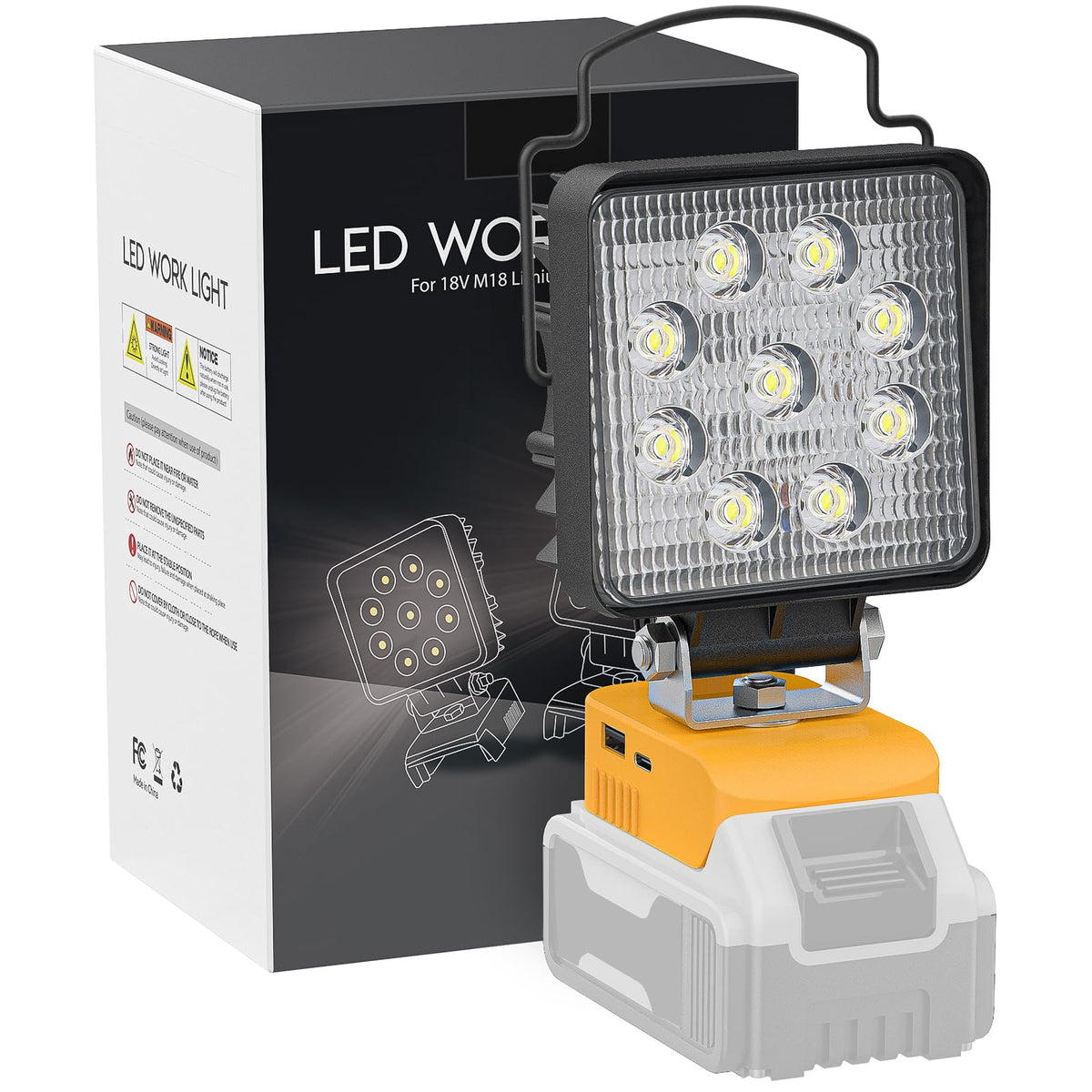 30W Tips: 20W LED Flood Lights can illuminate for 6-7 hours works on 5.0AH Battery. 30W LED Flood Lights can illuminate for 4-5 hours works on 5.0AH Battery. 34W LED Flood Lights can illuminate for 3-4 hours works on 5.0AH Battery. Specifications: Voltage: 18V/20V Max Wattage: High brightness 30W, Low brightness 15W Lumen: High brightness 3000LM, Low brightness 1500LM Beam Angle:120- 140 Color Temperature: 6000K-6500K, White Light Material: Aluminum Shell of Light Head , ABS and V2 Fireproof Base Light Head Size: 4.13*4.13*1.89inches (L*W*H) Total Height: 6.49inches Package Included: 1 * LED Work Light (Battery, USB and Type C Cable not Included) 1 * Manual 1 * Package Box