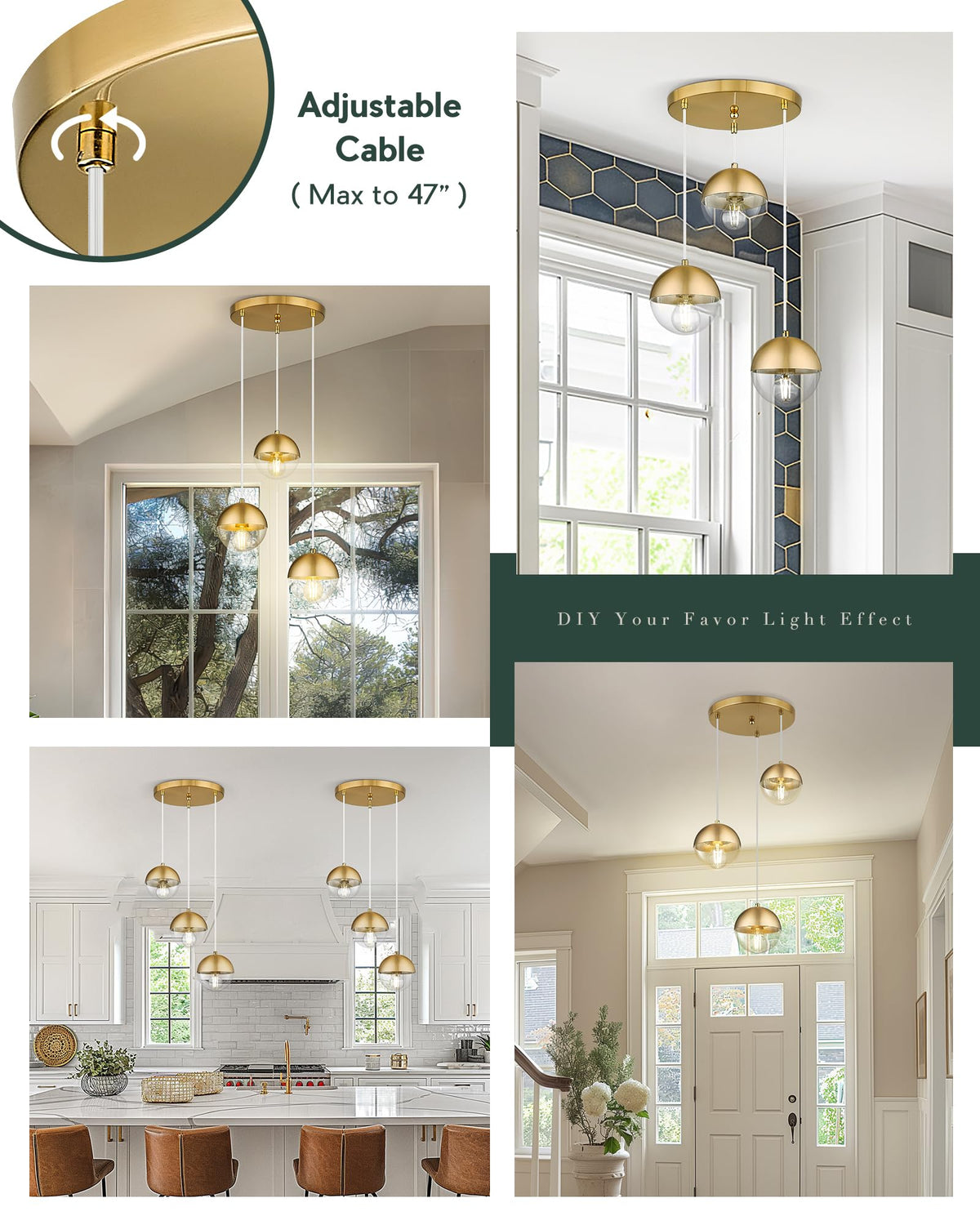 Q: Can the hanging height of this pendant light be adjusted?A: Yes, the pendant light features three adjustable cords that allow you to customize the hanging height up to a maximum of 57.25 inches. You can easily secure the desired height with the included set screw.