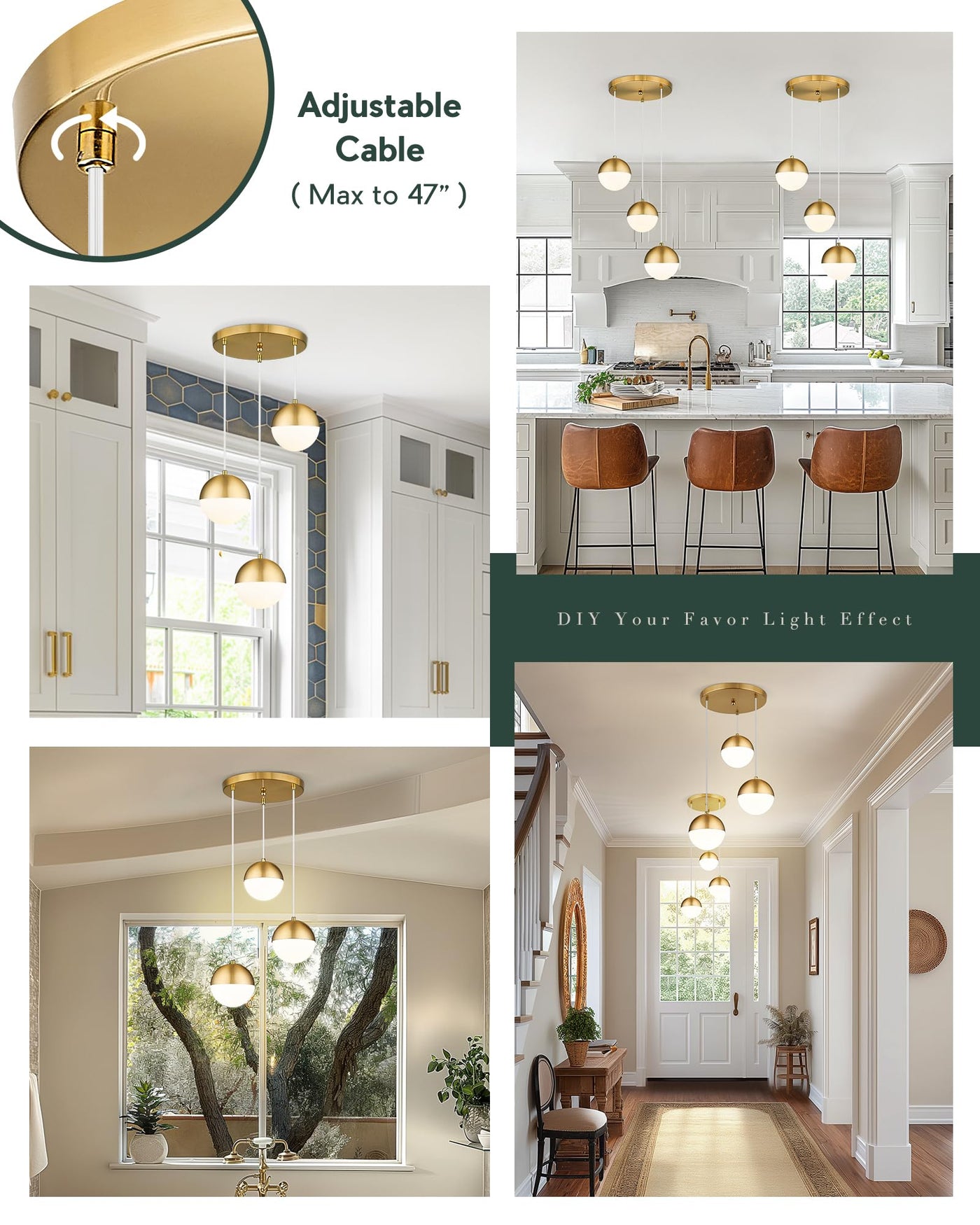 Lms Brushed Gold 3-Light Cluster Pendant Lights, Modern Kitchen Island Lighting With White Globe Glass Shade, Adjustable Hanging