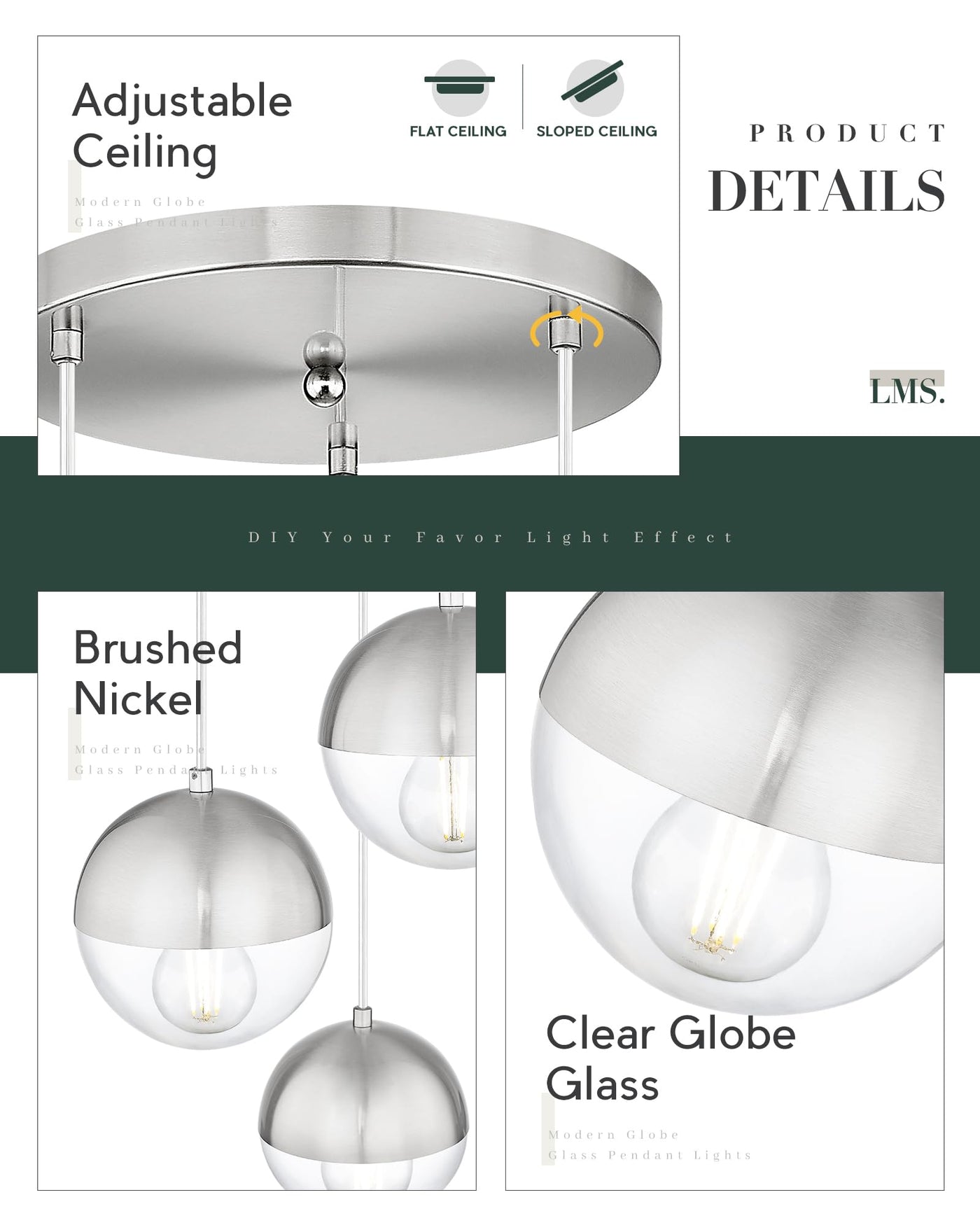 Lms Modern Brushed Nickel 3-Light Cluster Pendant Lights, Mid Century Pendant Lighting With Clear Globe Glass Shade, Adjustable