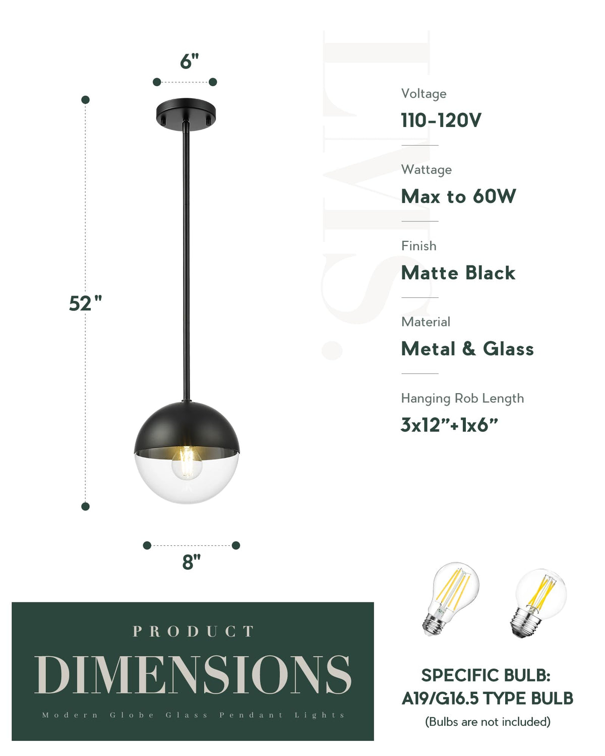 Q: What type of bulb is required for the LMS Modern Pendant Light?A: The LMS Modern Pendant Light requires 1 x E26 G16.5/A19 LED Edison Bulb, with a maximum wattage of 8W. Please note that the bulb is not included with the purchase.