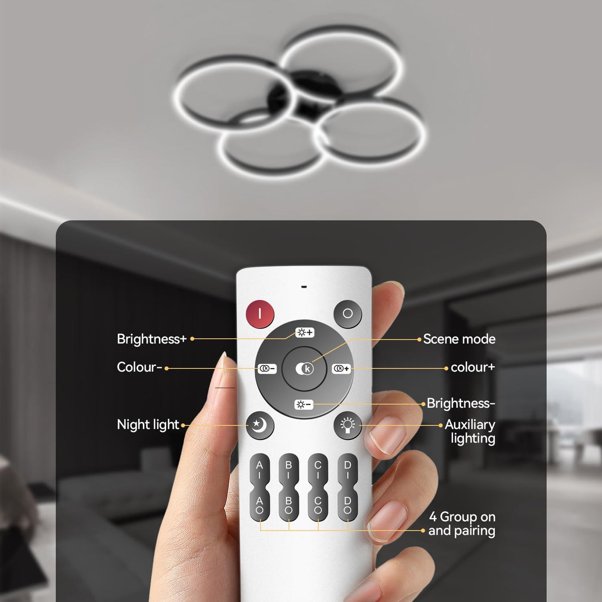 This elegant lighting fixture features a unique four-ring geometric design that adds a sleek touch to any room. Made from quality plastic, it is lightweight yet durable. The light is equipped with a 30W LED source, ensuring bright illumination while being energy-efficient and long-lasting. The adjustable brightness and color temperature allow for flexible lighting options to suit your mood and activities.