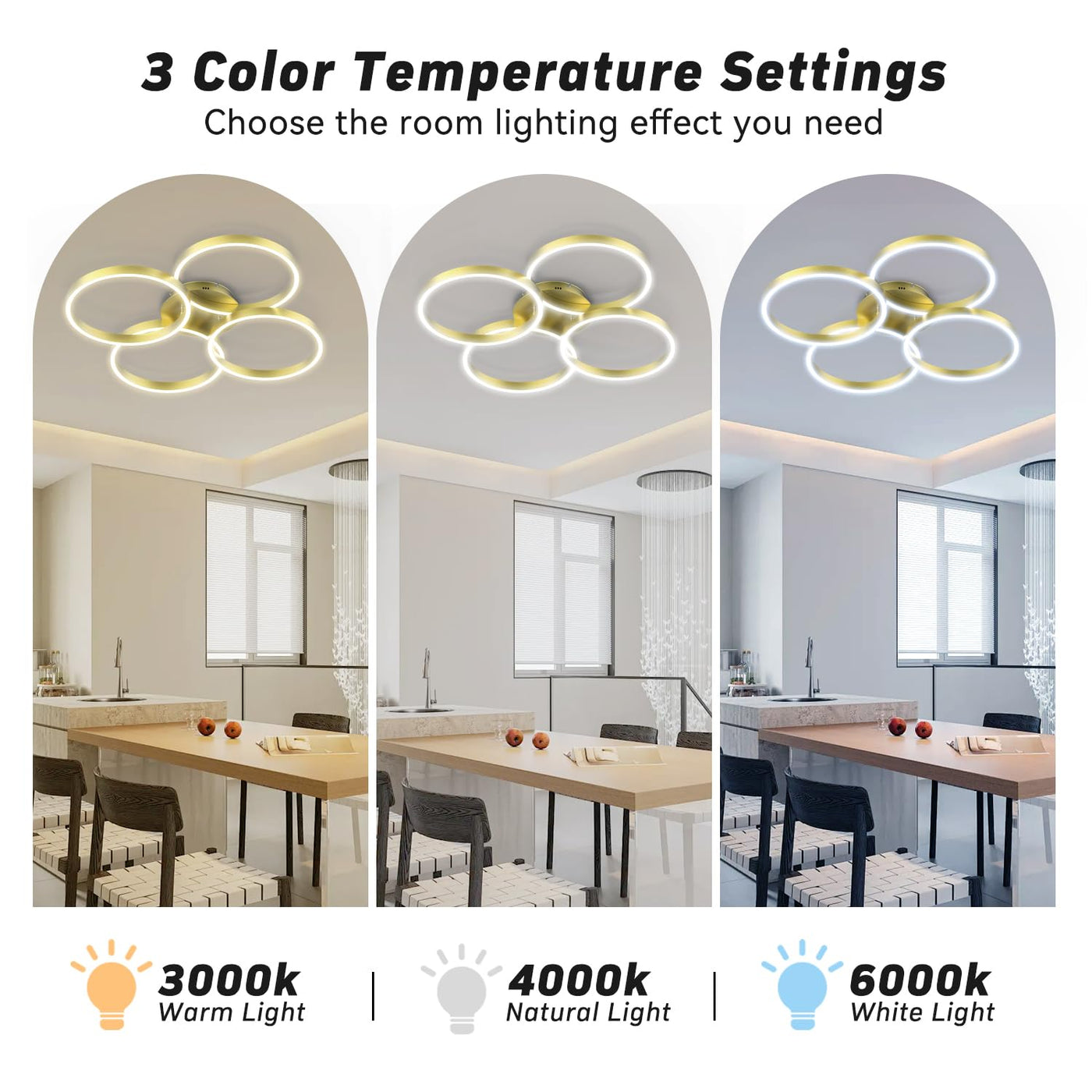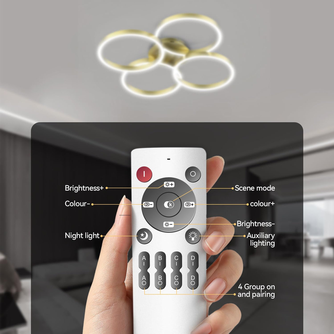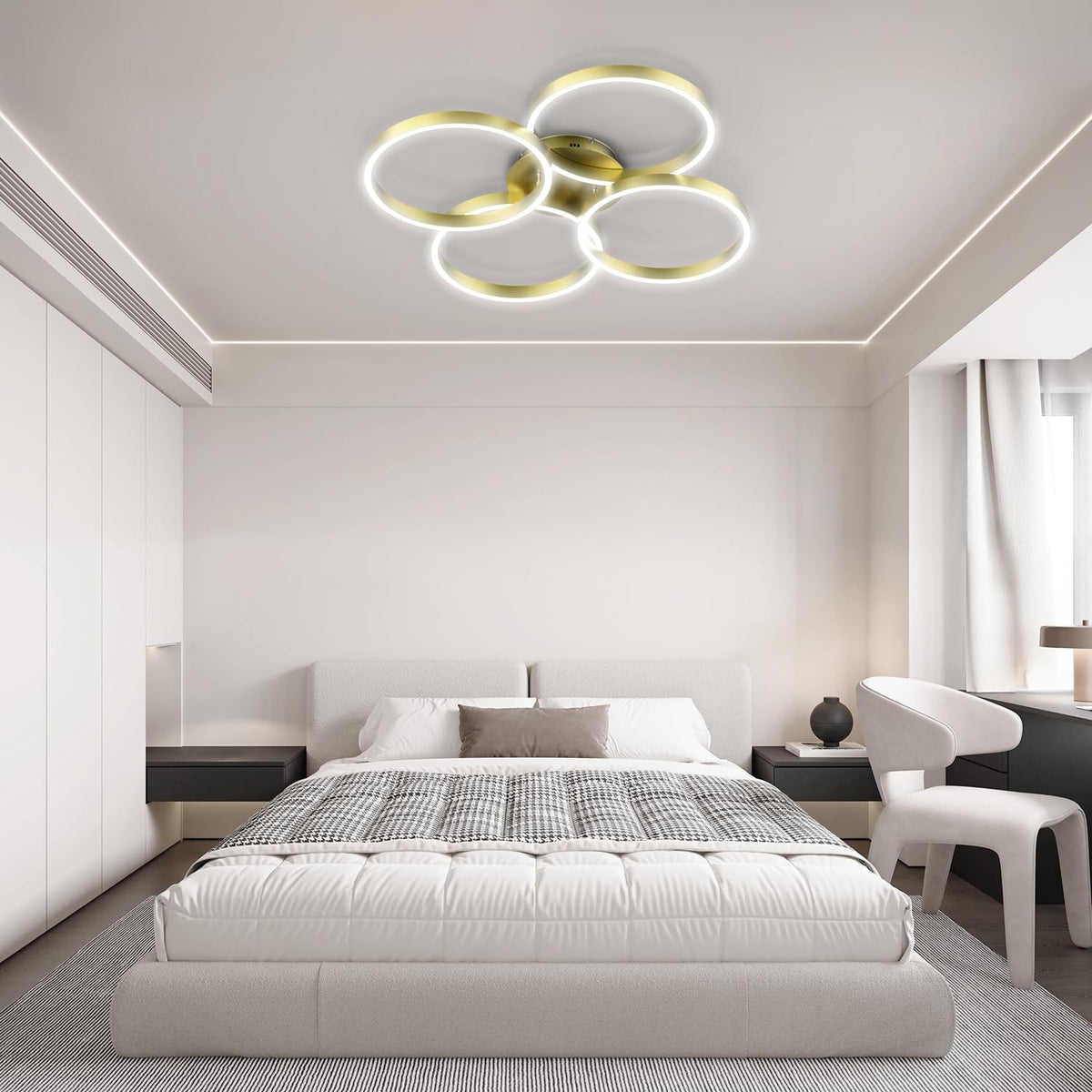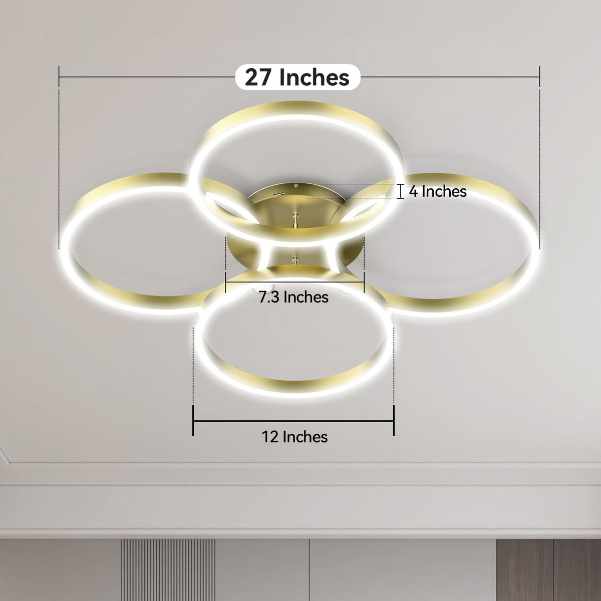 The ceiling light features a stylish four-ring geometric design in a sophisticated gold finish, making it an ideal addition to contemporary and traditional interiors alike. Crafted from well-made plastic, this fixture is not only durable but also lightweight for easy installation. Its modern aesthetic is complemented by advanced lighting technology, ensuring both beauty and practicality.