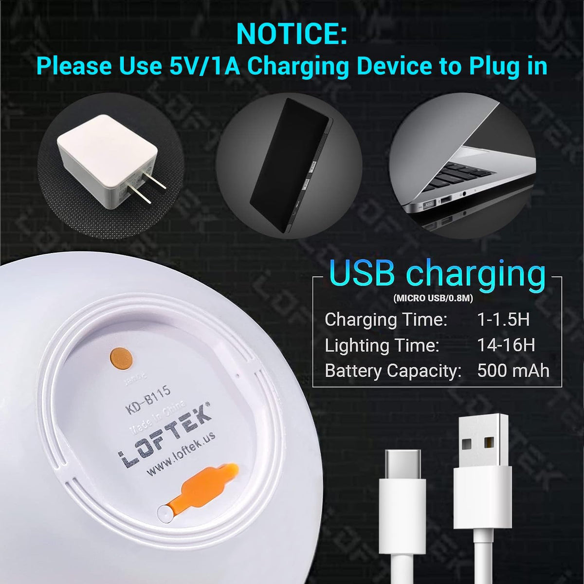 Q: What are the charging requirements for the LOFTEK LED Light Ball?A: The LOFTEK LED Light Ball requires a 5V/1A charging device to plug in. It features fast-charge technology, allowing it to be fully charged in just 1-1.5 hours, providing up to 14-16 hours of lighting.