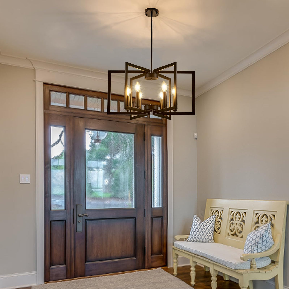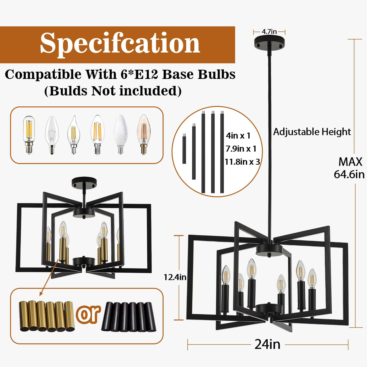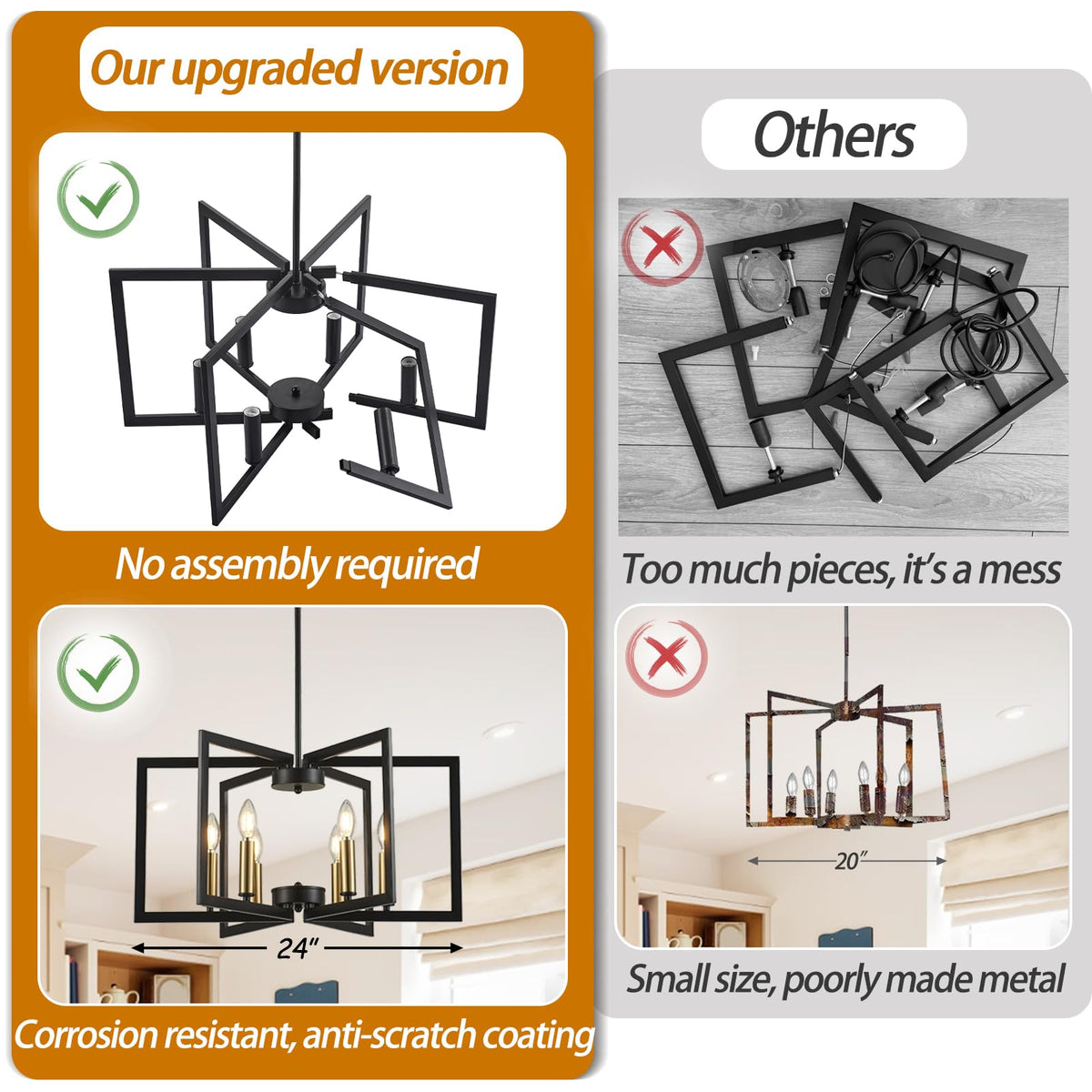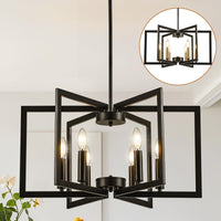 Transform your living space with this striking modern chandelier that combines geometric elegance with practical illumination. The bold black metal frame features clean lines arranged in an eye-catching open cube design, creating dramatic shadows and visual interest from every angle. Six candle-style lights provide warm, inviting illumination perfect for dining rooms, entryways, or living areas. The pendant light's minimalist aesthetic works seamlessly with contemporary, industrial, or transitional d cor styles. The durable metal construction ensures lasting quality, while the adjustable hanging rod allows for perfect positioning in rooms with varying ceiling heights. This statement piece measures approximately 24 inches wide, making it an ideal centerpiece for medium to large spaces. The matte black finish adds sophistication while complementing existing fixtures and hardware throughout your home.