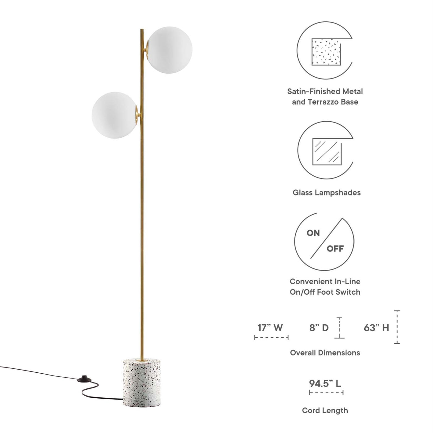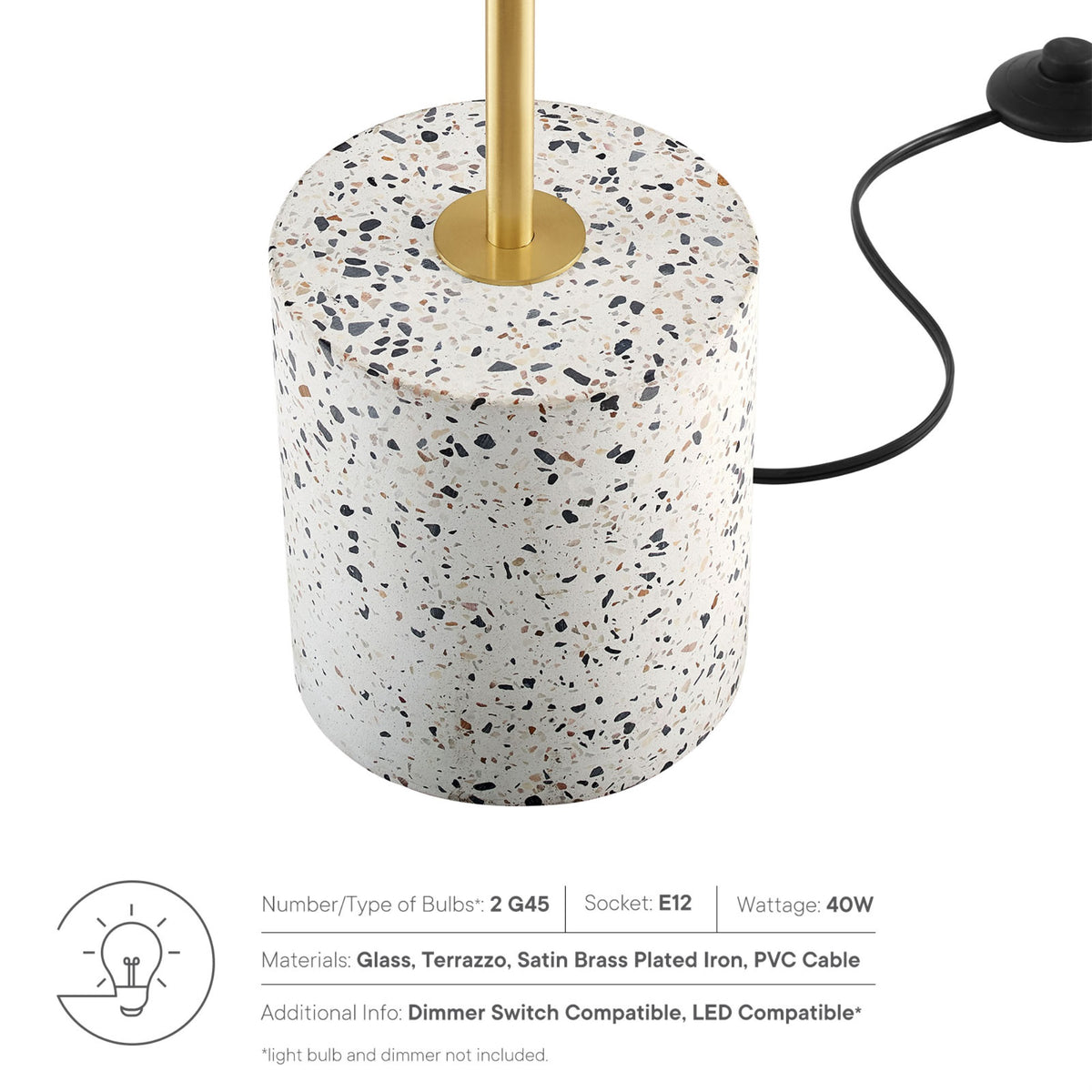 Bring intrigue into your home ambient lighting with the Logic 2-Light Terrazzo Floor Lamp in your bedroom, living room, office, entryway, or study. This standing lamp dispenses a tranquil aura complementing mid-century modern, contemporary, or eclectic decors. Logic features two opaque glass globe shades set vertically on a satin brass rod rising from a terrazzo cylinder base, a captivating light for the living room. This sculpted reading floor lamp, equipped with a black power cord and an on/off foot switch, takes 2 G45 E12 40W max bulbs or LED equivalent (not included). Compatible with dimmer switches (not included). Assembly required. Clean with a soft, damp cloth. Set Includes: 1 - Logic