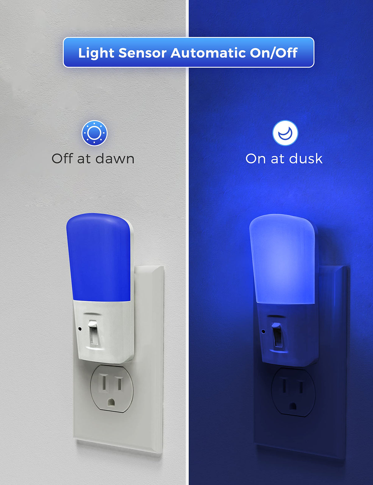Q: How does the dusk to dawn sensor work on this night light?A: The dusk to dawn sensor automatically detects surrounding light levels. It will turn on the blue light when it gets dark enough, ensuring you have a guiding light at night without needing to manually switch it on.