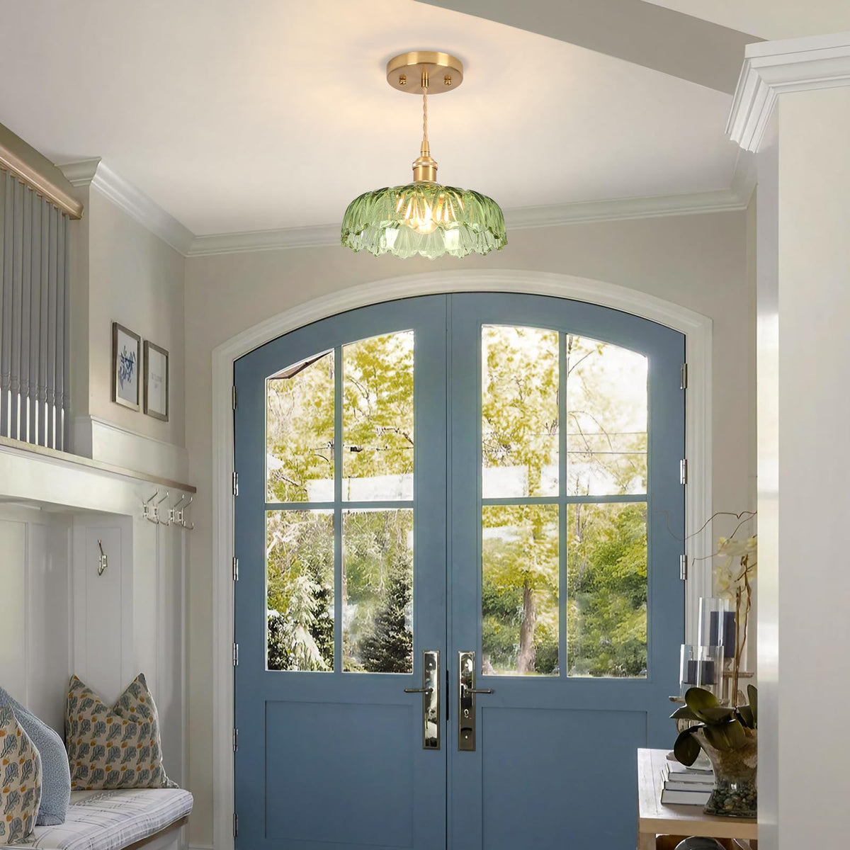 Q: What material is the pendant light made of?A: The pendant light is made of glass and features polished brass fittings that are durable and moisture-proof.