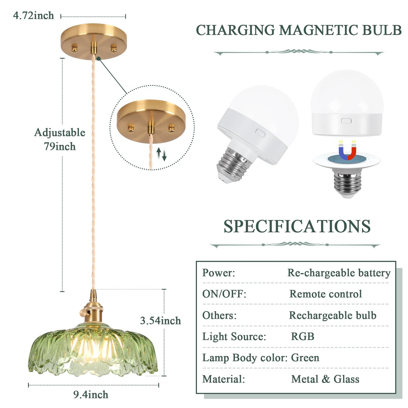 Loiogohot Battery Operated Pendant Light, Vintage RGB Chandelier 9.4in, Glass, Scindapsus Green, Model PL-BN1167-CD-GN