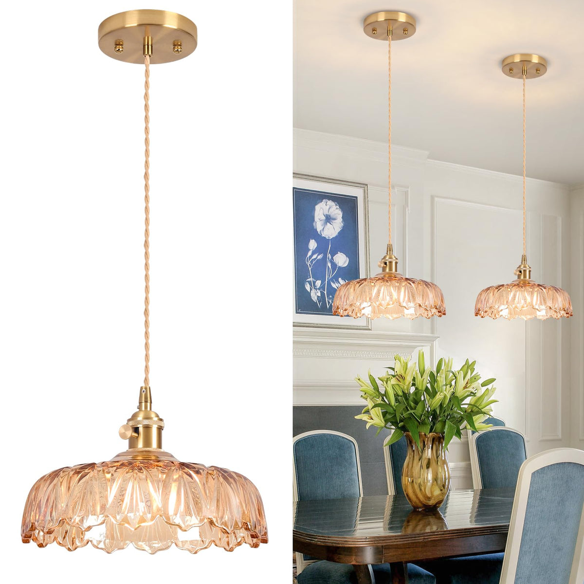 Loiogohot Glass Pendant Light Vintage Light Fixtures,Amber Modern Chandelier Pendant,E26 Pendant Lights Kitchen Island,9.4Inch H