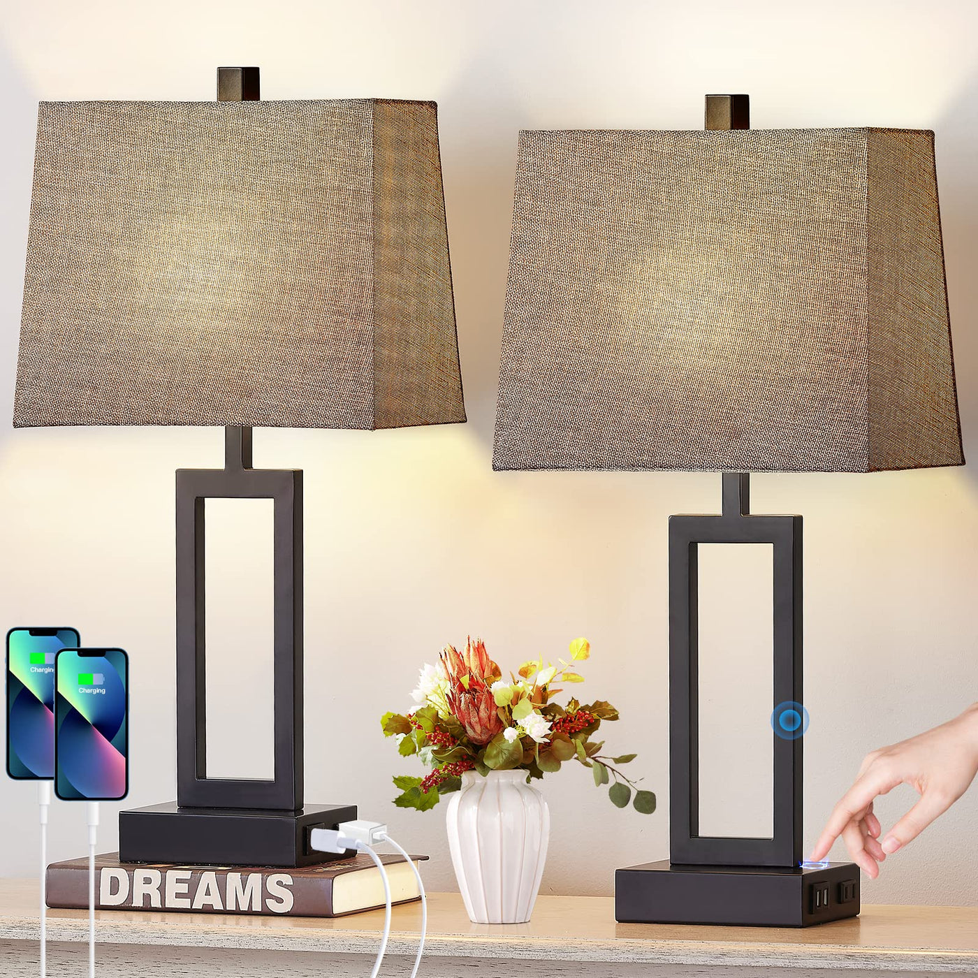Q: What are the benefits of the built-in USB ports and AC outlet on the table lamps?A: The built-in dual USB ports (5V/2.1A) and AC outlet (120V) allow you to charge multiple devices simultaneously, such as smartphones, tablets, and laptops, without needing to find an extra power socket. This feature helps keep your bedside or living room table organized and clutter-free.