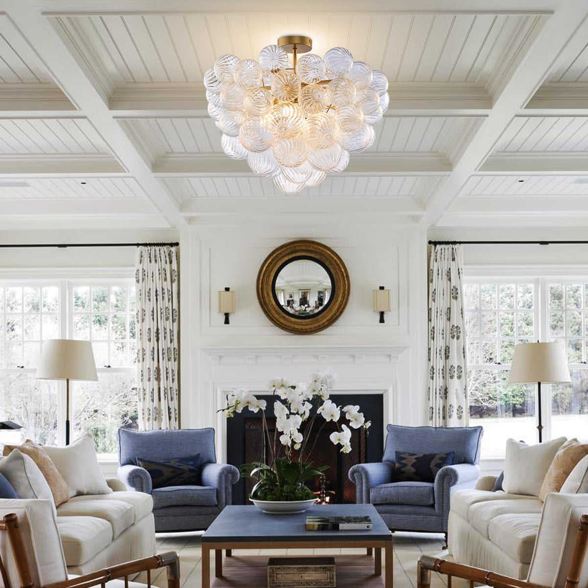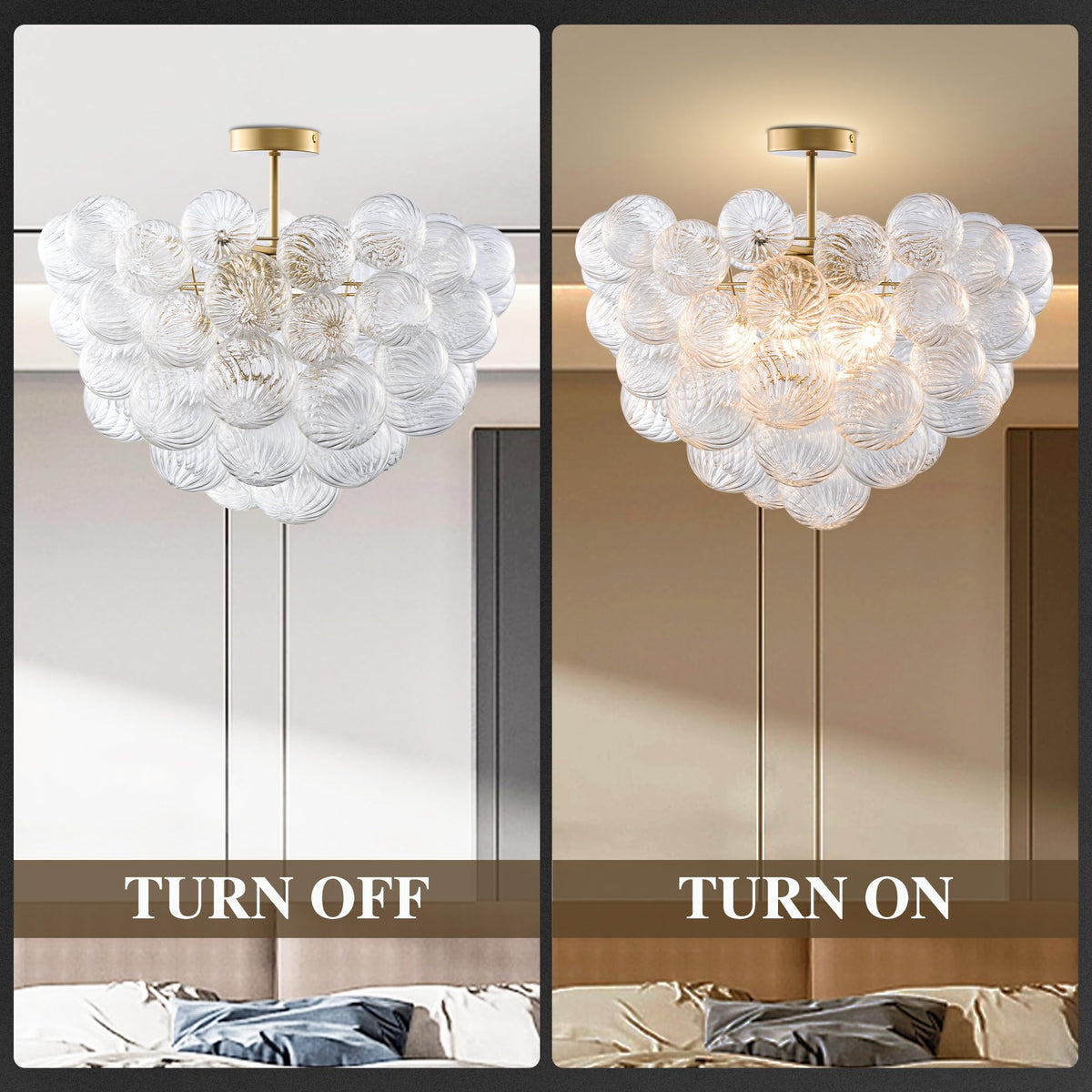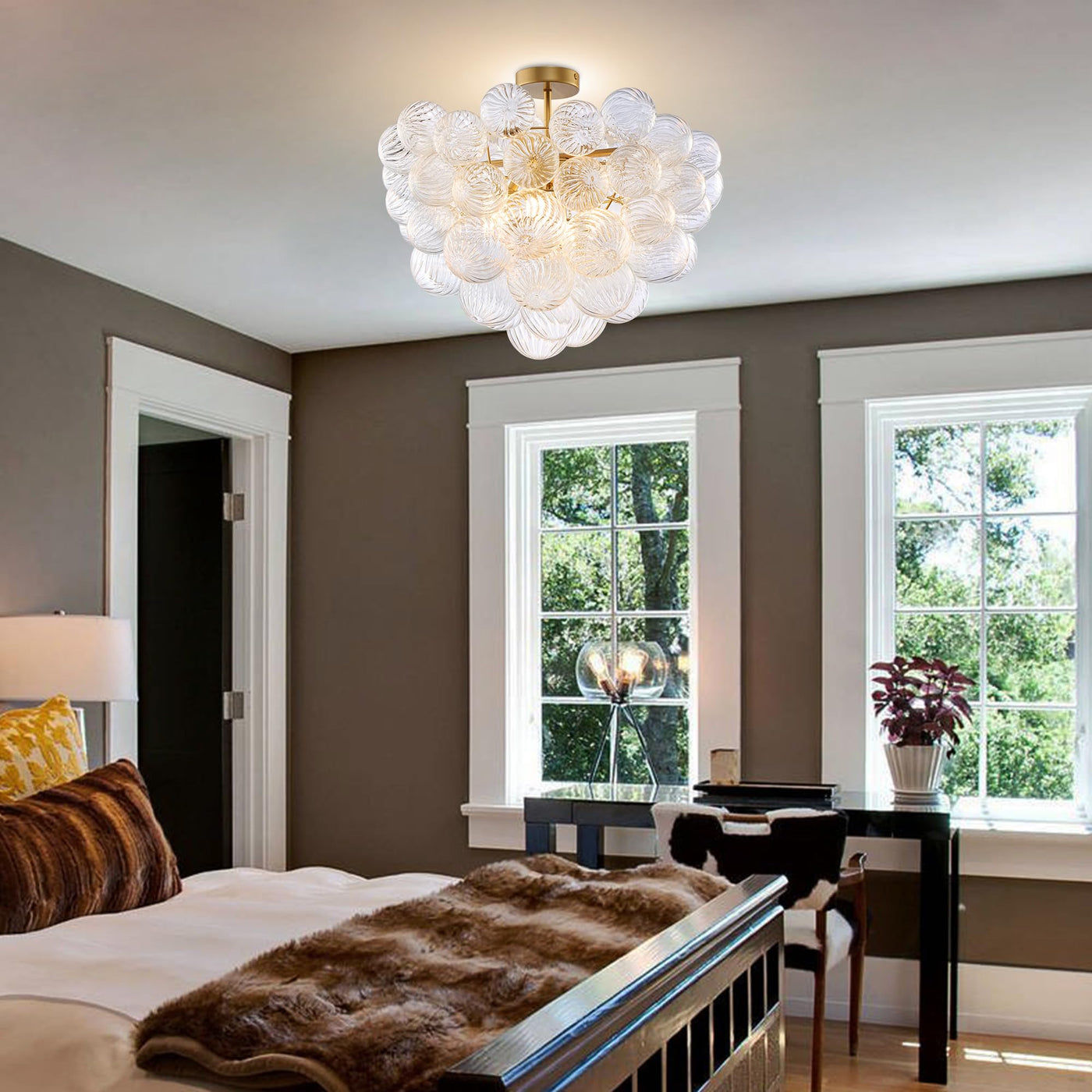 Longree Nordic Bubble Ball Swirled Glass Semi-Flush Mount Ceiling Lights Fixture, Dia 24 Inch Gild Brass And Clear Blown Glass Small Chandelier For Bedroom Study Bathroom
