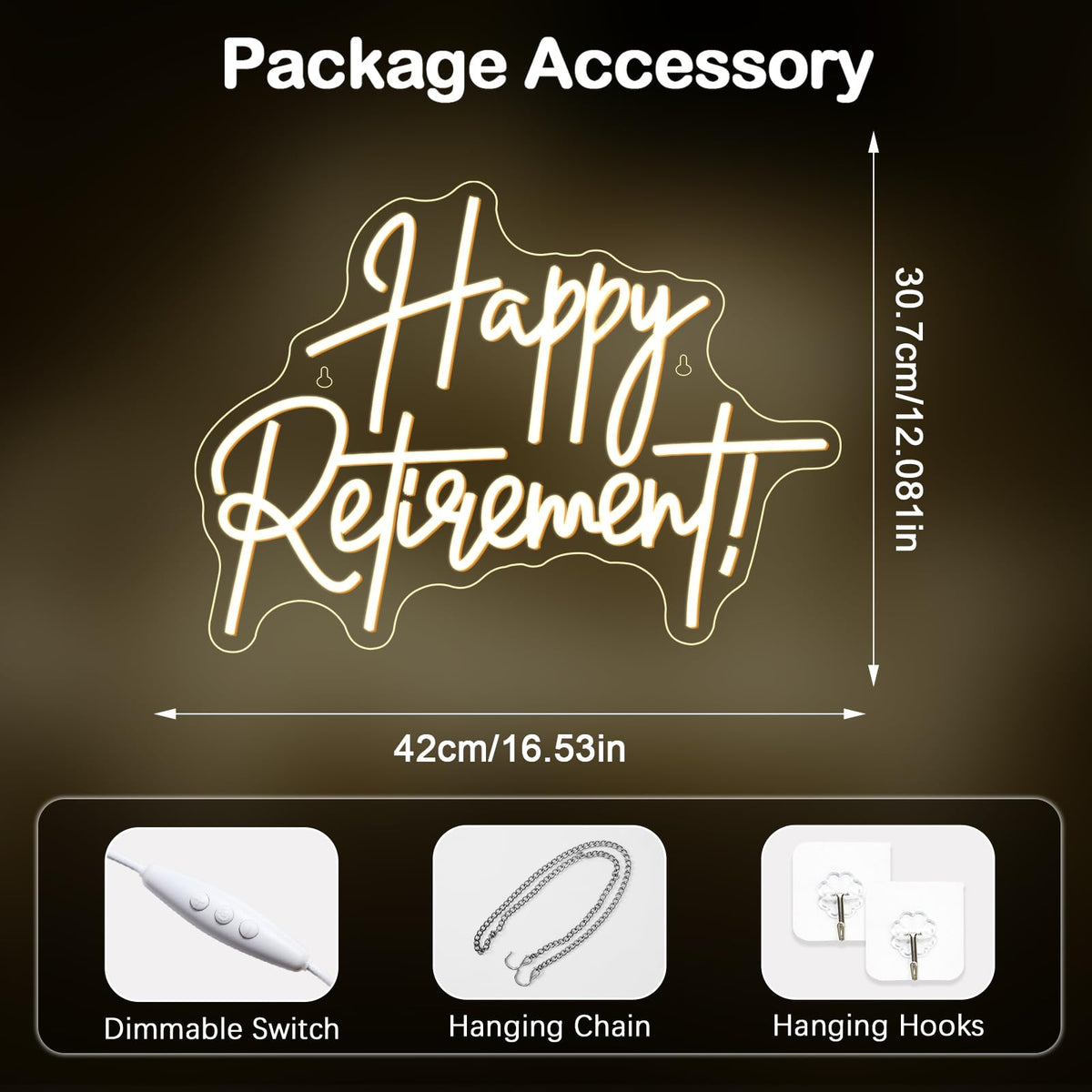 The Looklight Happy Retirement Neon Sign Is A Stylish And Vibrant Addition To Birthday Party Hoom Bedroom And Other Scenes Making It An Eye-Catching Visual Centerpiece. Measuring 16.54 X 12.09 Inches Its Versatile Design Allows It To Enhance Any Setting-Whether YouRe A Fashion Enthusiast Decorating Your Room Or Creating A Unique Celebrations Atmosphere This Neon Light Instantly Boosts The Personality And Recognition Of Your Space.Installation Is Quick And Hassle-Free Thanks To The Pre-Drilled Holes Allowing You To Easily Mount Or Move It As Needed-Simply Secure It In Your Desired Spot And Power It Via The Included Usb Interface. With Dimmable Led Lights You Can Adjust The Brightness To Set The Perfect Mood. Backed By A Comprehensive After-Sales Service You Can Purchase And Enjoy This Neon Sign With Confidence Knowing Youre Getting A well-made And Worry-Free Product.