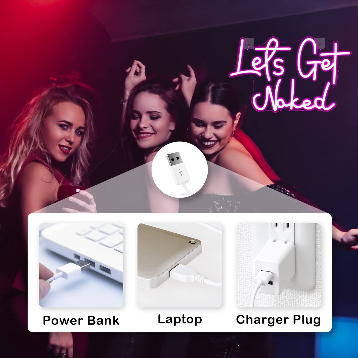 Q: How is the Let's Get Naked Neon Sign powered?A: This neon sign is USB powered, making it easy to connect to a power source such as a USB wall adapter or a power bank for versatile placement.