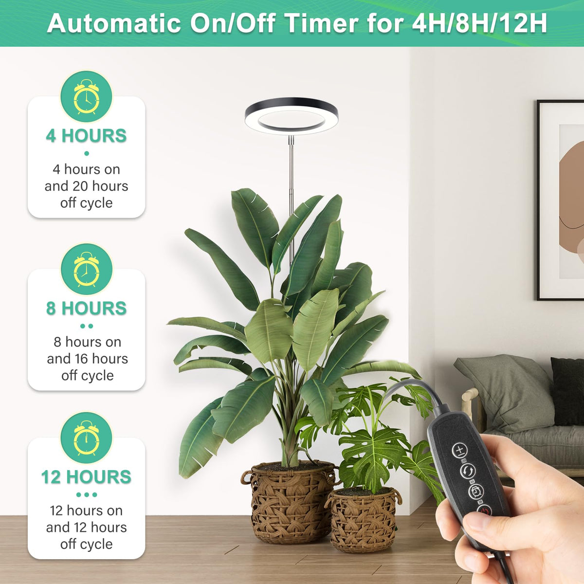 Q: How do I set the auto timer on the grow light?A: The grow light comes with an easy-to-use auto on/off timer that allows you to choose from 4, 8, or 12-hour cycles. Simply select your desired duration, and the light will automatically turn on and off according to your preset schedule, making it convenient for maintaining a consistent lighting routine for your plants.
