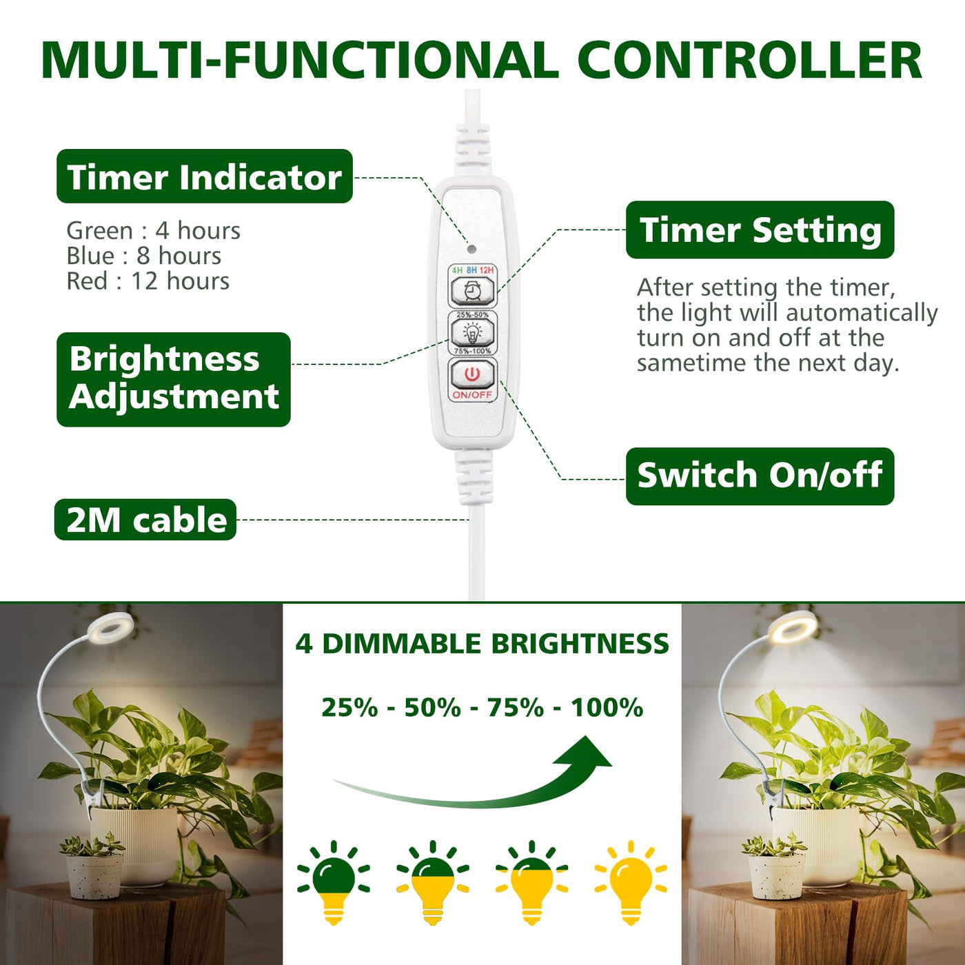 Lordem Grow Light,Full Spectrum Pot Clip Led Plant Growth Light With Auto On/Off Timer 4/8/12H,Plant Lamp With 360°Rotatable Gooseneck, 4 Dimmable Brightness, Ideal For Small Indoor Plants, 2 Pack
